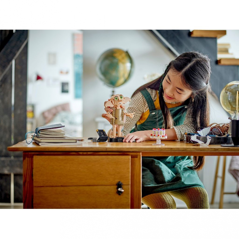 Figurina din caramizi imediat recognoscibila are capul articulat pentru diferite expresii, iar bratele si degetele articulate ii permit lui Dobby sa tina accesoriile emblematice incluse.