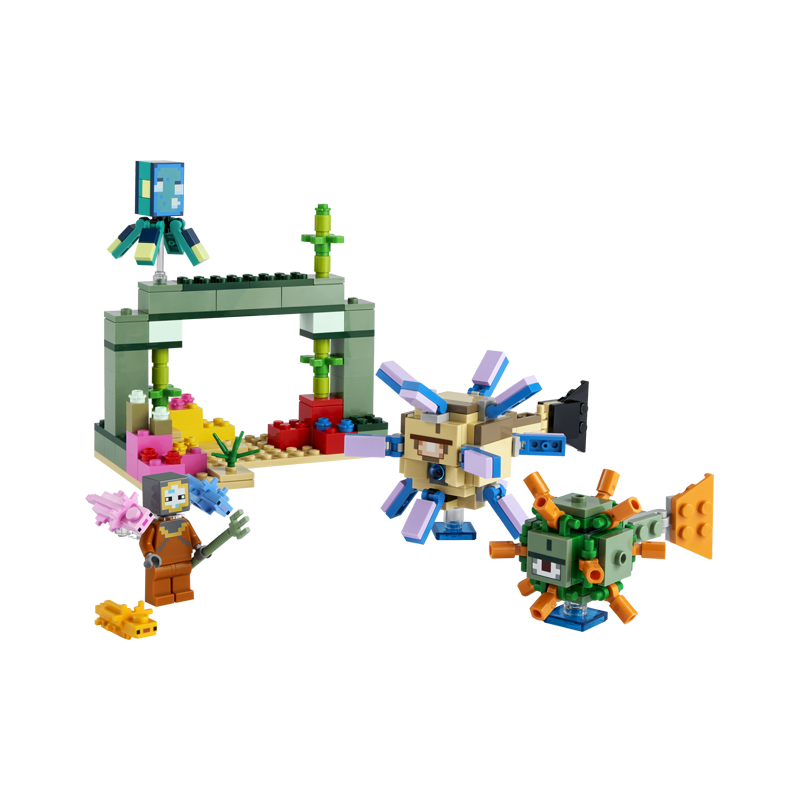 LEGO Minecraft Duelul cu Guardian-ul (21180) te poarta intr-o aventura subacvatica plina de personaje cunoscute si detalii exact ca in jocul video.Copiii pot porni in aventuri pline de actiune cu acest set Minecraft aflat in adancurile oceanului. Întai trebuie sa construiasca un monument printre coralii colorati. Exista comori ascunse de descoperit, dar si 2 inamici Minecraft bine cunoscuti un Guardian si un Elder Guardian, care sunt hotarati sa opreasca orice intrus! Înarmati cu un trident si ajutati de 3 axolotl prietenosi, copiii trebuie sa se apere de inamici pentru a isi continua misiunea. Pericolul nu se opreste aici pentru ca un lansator cu arc se ascunde in gura Elder Guardian-ului, care poate fi actionat dintr-o simpla miscare a cozii acestuia. Cu nenumarate posibilitati creative de joaca, aceasta aventura din caramizi LEGO va pune toata actiunea jocului video Minecraft in mainile copiilor.Aventura subacvatica LEGO Minecraft Duelul cu Guardian-ul (21180) ofera jucatorilor o misiune creativa pe fundul oceanului, plina de personaje si detalii reproduse din celebrul joc video. Actiune autentica Reciful de corali si monumentul includ si personaje Minecraft cunoscute un scafandru, o sepie luminoasa, un Guardian, un Elder Guardian si 3 axolotl. Joaca activa Ai un monument de construit, comori de gasit si inamici de invins intr-o aventura Minecraft care pune toata actiunea in mainile copiilor. Cadou versatil Acest set e plin de potential de joaca si cu siguranta va captiva si distra jucatorii de Minecraft cu varsta de la 8 ani in sus. Posibilitati nelimitate Acest set masoara peste 12 cm inaltime, 12 cm latime si 7 cm lungime. Minecraft in realitate seturile LEGO Minecraft ofera jucatorilor un nou mod de a se bucura de jocul lor preferat, cu personaje, scene si functii aduse la viata folosind o selectie distractiva de piese si caramizi LEGO.