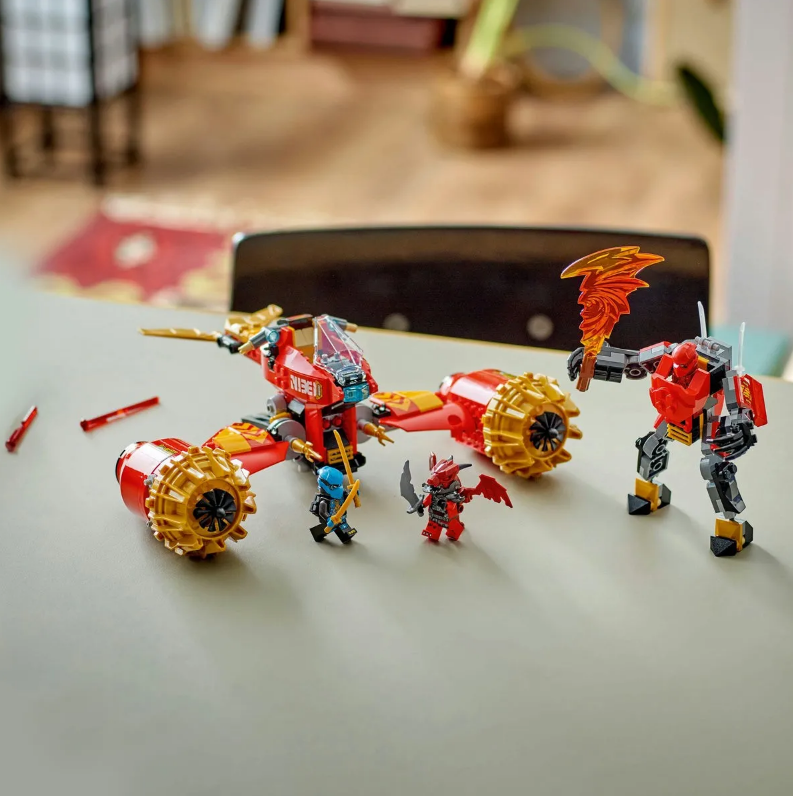 Copiii pot explora jucaria de actiune voluminoasa inainte de a o separa in 2 vehicule mai mici robotul lui Kai cu capul, bratele si picioarele articulate, o carlinga si o sabie mare furtunoasa si motocicleta zburatoare a Nyei cu o carlinga, aripi mobile si 2 shooters cu arcuri.
