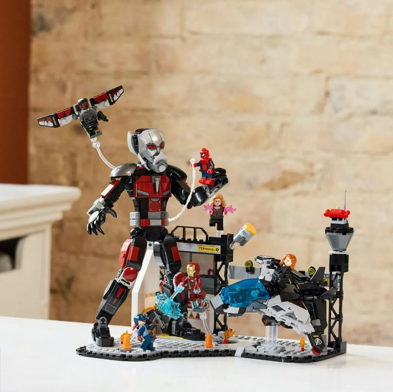 Setul include 8 minifigurine Capitanul America, Winter Soldier, Wanda, Falcon, Iron Man, Omul Paianjen, Black Widow si Black Panther, cu arme si accesorii, plus un Ant-Man complet articulat, cu inaltimea de 24 cm.