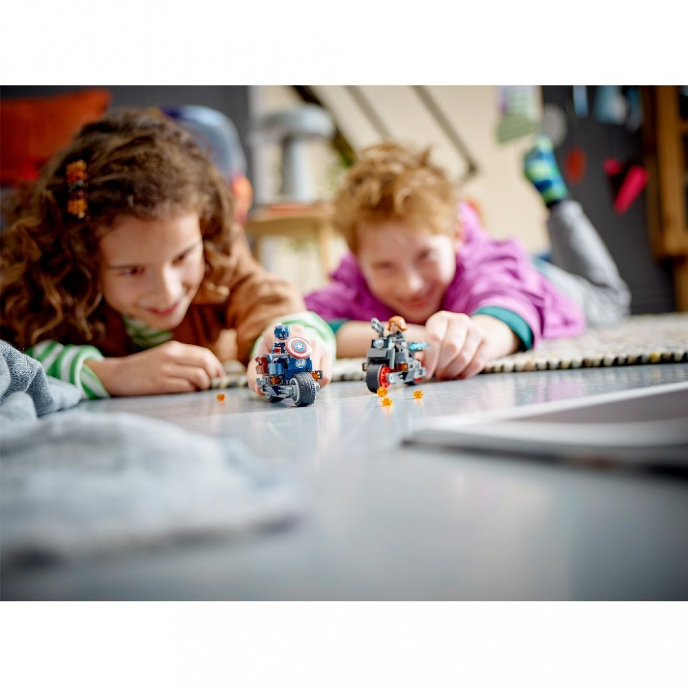 Bazati pe o scena din Razbunatorii Sub semnul lui Ultron, creat de Marvel Studios, acesti supereroi pe motociclete ii vor transporta pe copiii de 6+ ani pe un drum nesfarsit de aventuri fanteziste.Minifigurinele Capitanul America si Black Widow calatoresc pe motocicletele vazute in premiera in memorabilul film Razbunatorii Sub semnul lui Ultron, creat de Marvel Studios in 2015.