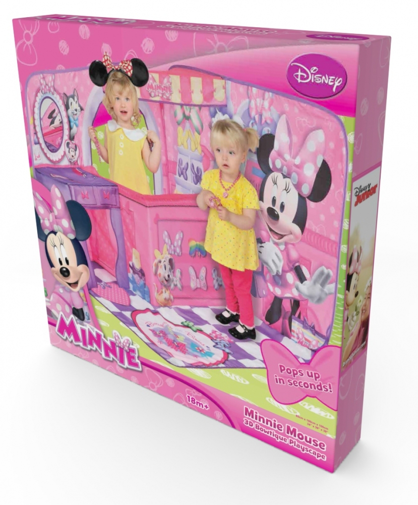 Locul de joaca 3D Minnie Bow Tique permite copiilor sa intre in lumea Minnie si sa lucreze cu ea in "boutique-ul" ei. Locul de joaca are o zona delimitata de unde sunt serviti "clientii", o masuta si o oglinda, accesorii care le vor face fericite pentru mult timp pe micutele fetite.