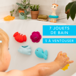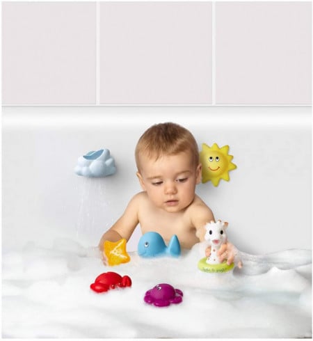 - 4 pulverizatoare cu ventuză: caracatița, crabul, balena și soarele, pot fi folosite fie ca stropitori, fie ca plutitoare în cadă