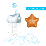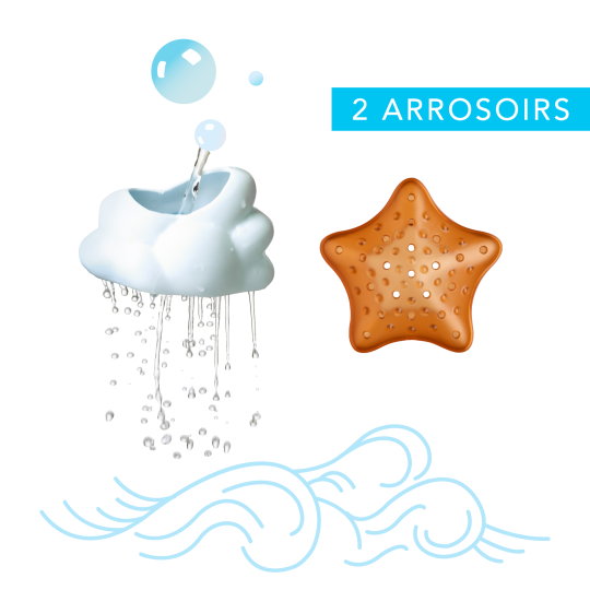 - 2 strecuratori de apa din plastic, una în formă de stea de mare, cealaltă în formă de nor cu ventuză în spate.