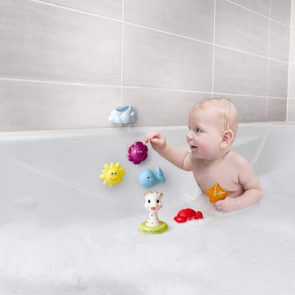 - 1 plutitor și stropitor Sophie la girafe: Ușor de prins și manevrat cu mâinile mici, copilul îl poate prinde cu ușurință în baie.