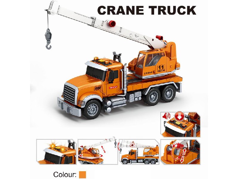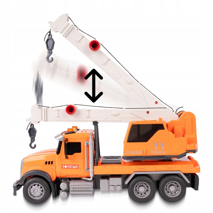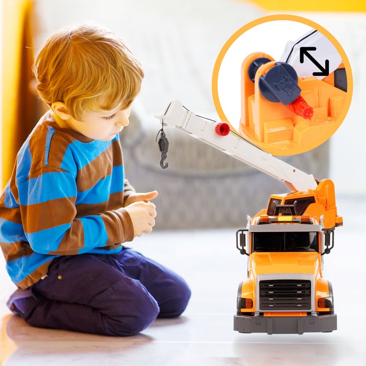 Macara de jucarie pentru copii, constructie solida, detalii realiste cu brat mobil rotire 360, carlig, lumini intermitente si sunete realiste, scara 1:14