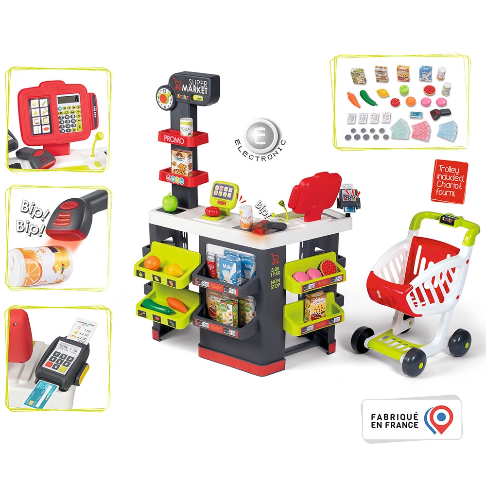 - Magazinul cu casa de marcat, cantar, carucior si 42 de accesorii stimuleaza imaginatia copiilor si dezvolta abilitatea de a juca roluri, scenarii