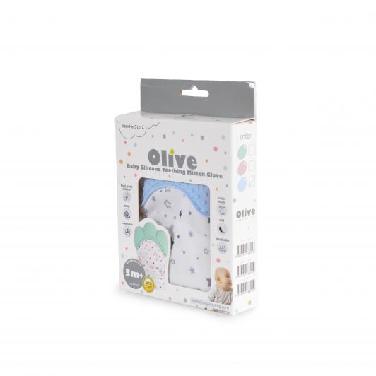 Manusa de dentitie din silicon „Olive” este destinata copiilor de la 3 luni. Fabricata din material moale, respirabil si delicat cu pielea delicata a bebelusului si silicon moale, fara BPA.