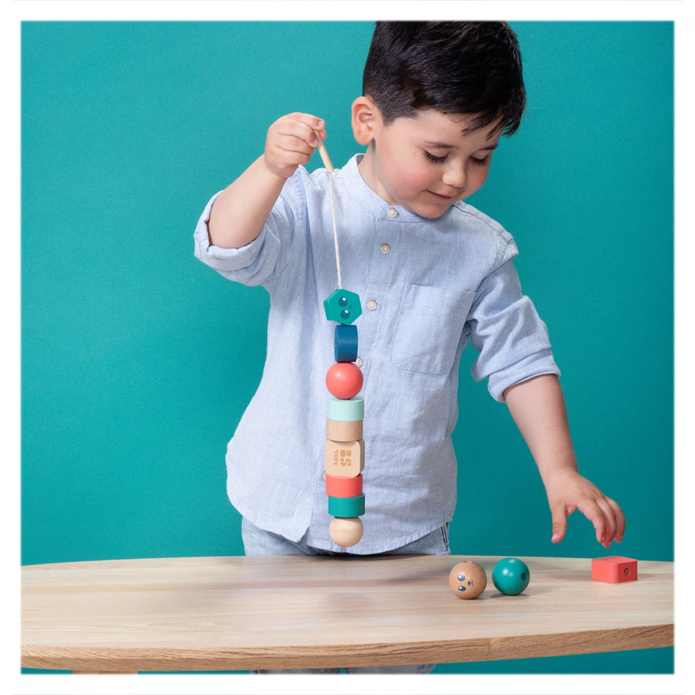 • Setul include 12 margele mari, colorate din lemn, unele dintre ele imprimate cu fete amuzante, si un snur rezistent cu capete din lemn, usor de manevrat de mainile mici.