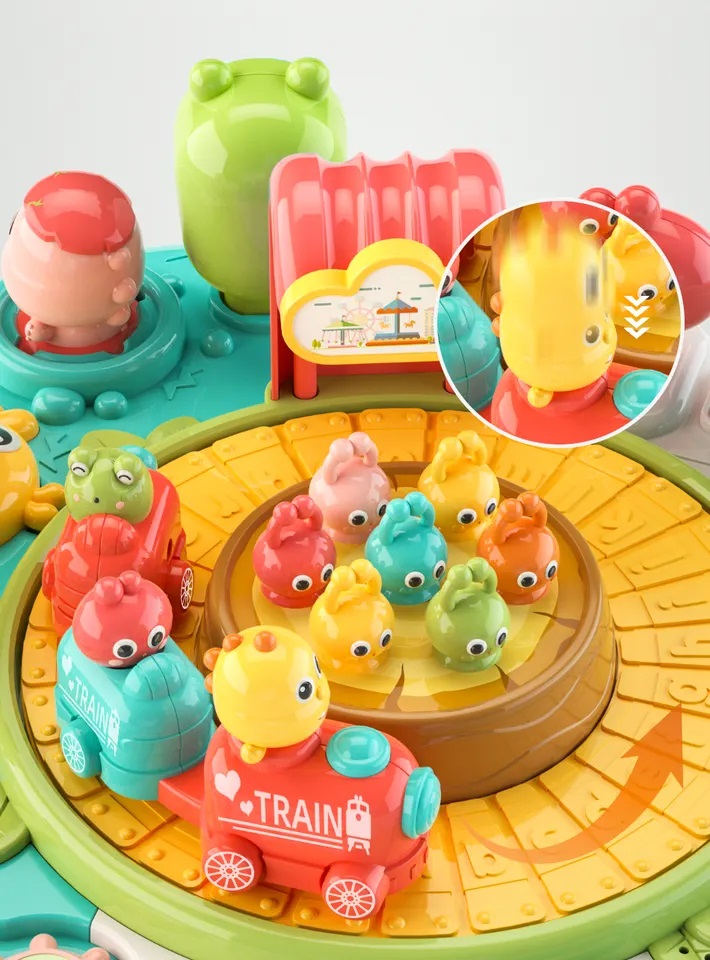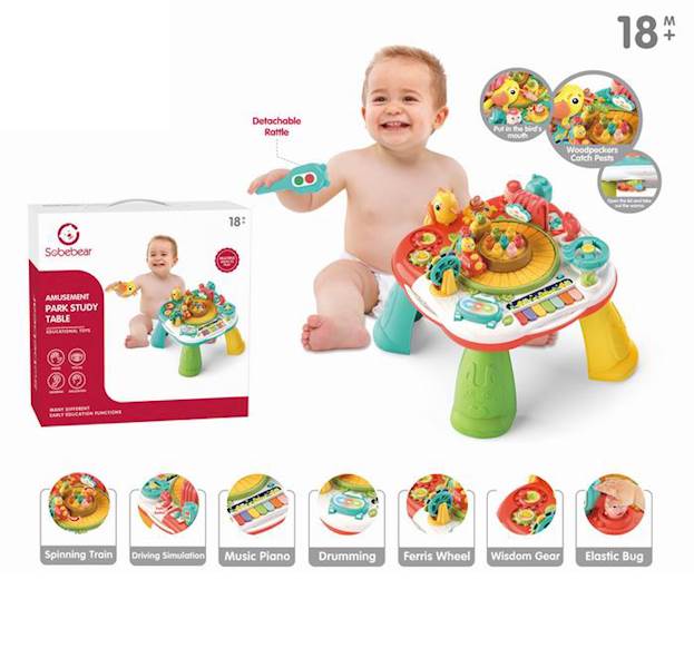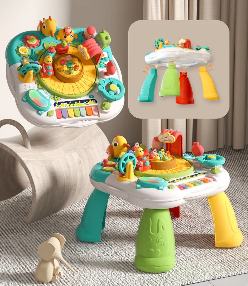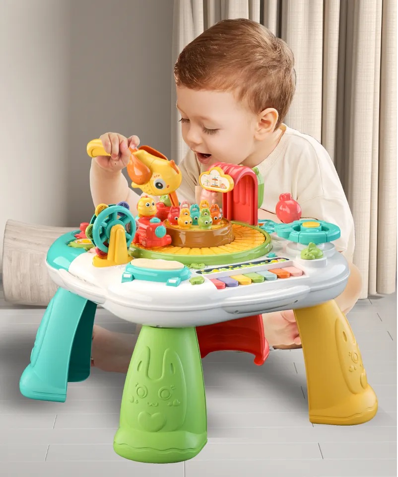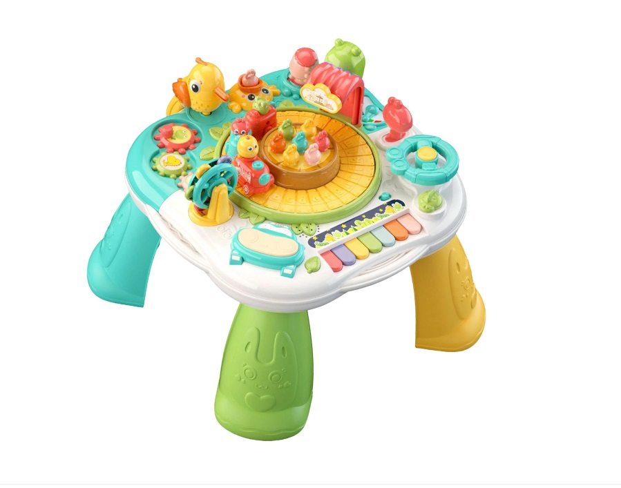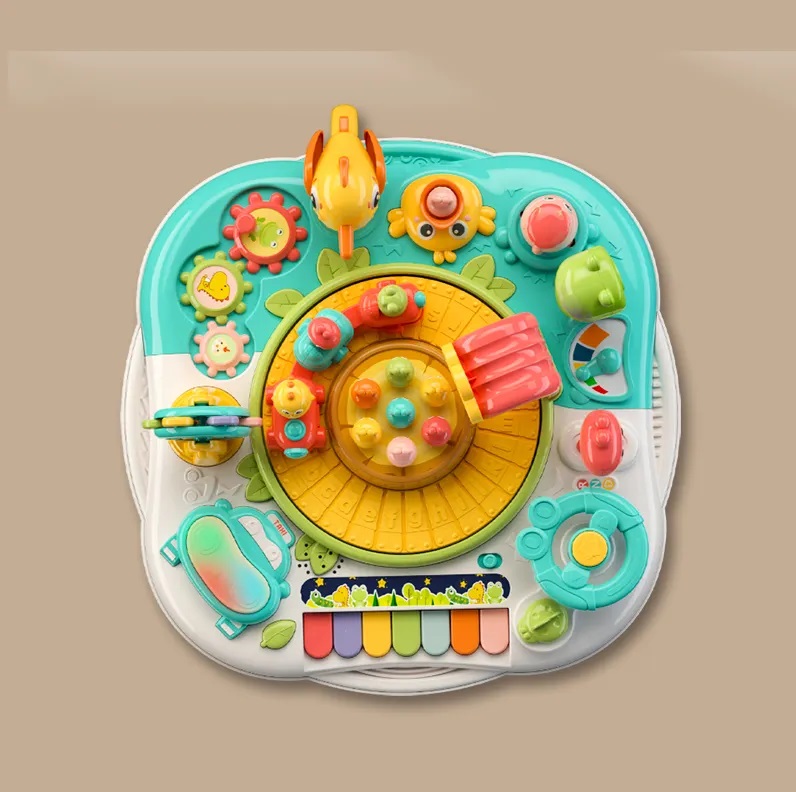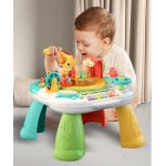 O masuta cu un panou interactiv 2 in 1, va va incuraja copilul sa-si dezvolte abilitatile motorii si manuale, auzul si capacitatea de a intelege lumea, formele si culorile prin joc.