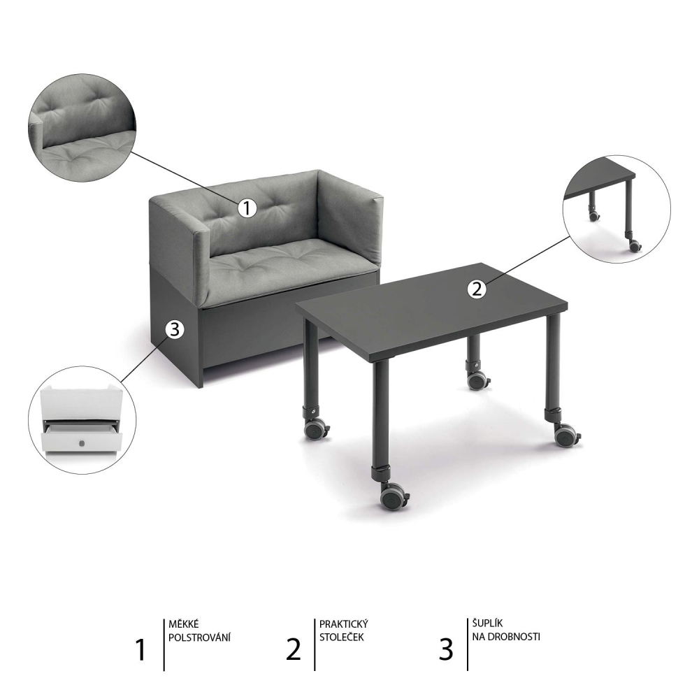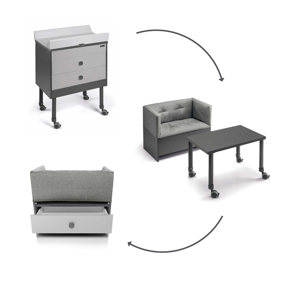 Cand bebelusul nu mai are nevoie de masa de schimbat, cufarul cu sertare poate fi transformat cu usurinta intr-o canapea practica pentru bebelusi, cu spatiu de depozitare si o masa unde copilul se poate odihni, juca sau picta. Pernele moi ale canapelei sunt incluse.
