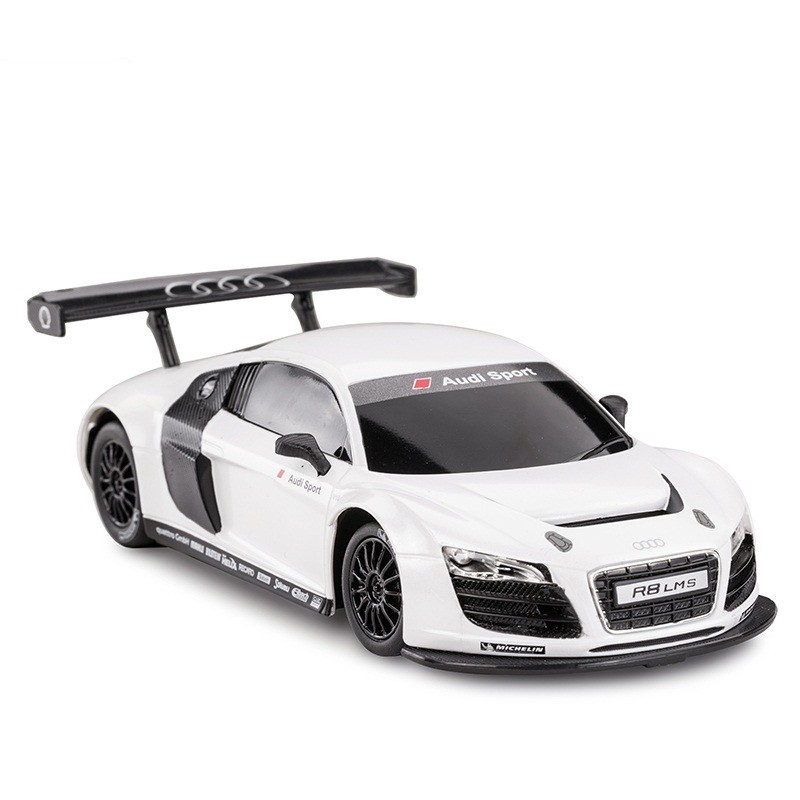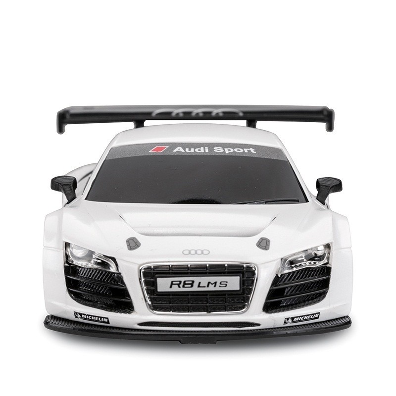 Masina cu telecomanda Audi R8, scara 1 la 24, poate rula cu o viteza aproximativa de 10km/h, are tractiune 2WD, anvelope de cauciuc, posibilitate de reglaj a directiei direct pe sasiu si o raza de actiune a telecomenzii de circa 20 de metri.