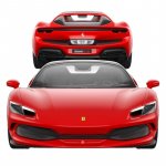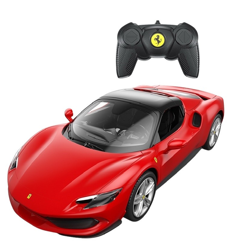 Masina cu telecomanda Ferrari 296 GTS, scara 1 la 16, poate rula cu o viteza aproximativa de 10km/h, are tractiune 2WD, anvelope de cauciuc, posibilitate de reglaj a directiei direct pe sasiu si o raza de actiune a telecomenzii de circa 20 de metri.