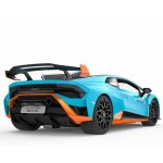 Copilul dumneavoastra se poate juca in voie cu masina cu telecomanda Lamborghini Huracan STO albastru, scara 1 la 14, oferita de brandul international Rastar.