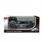 • Masina cu telecomanda Porsche 911 Sport Classic, scara 1 la 16, poate rula cu o viteza aproximativa de 10km/h, are tractiune 2WD, anvelope de cauciuc, posibilitate de reglaj a directiei direct pe sasiu si o raza de actiune a telecomenzii de circa 20 de metri.