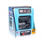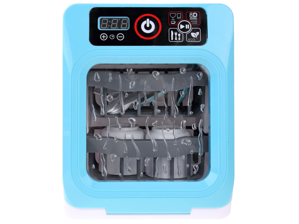 Masina de spalat vase pentru copii albastra, efecte sonore si luminoase, afisaj electronic, cu tacamuri si vesela inclusa, dimensiune 23 x 17 x 14 cm