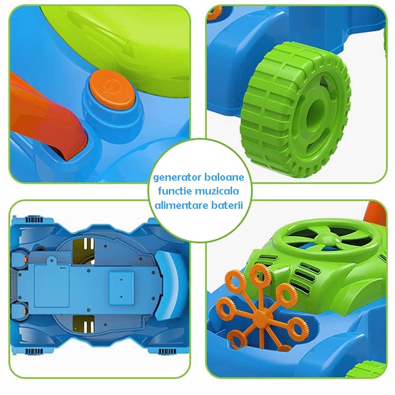 Masina de tuns iarba interactiva, generator baloane de sapun, muzica, solutie inclusa, cu baterii