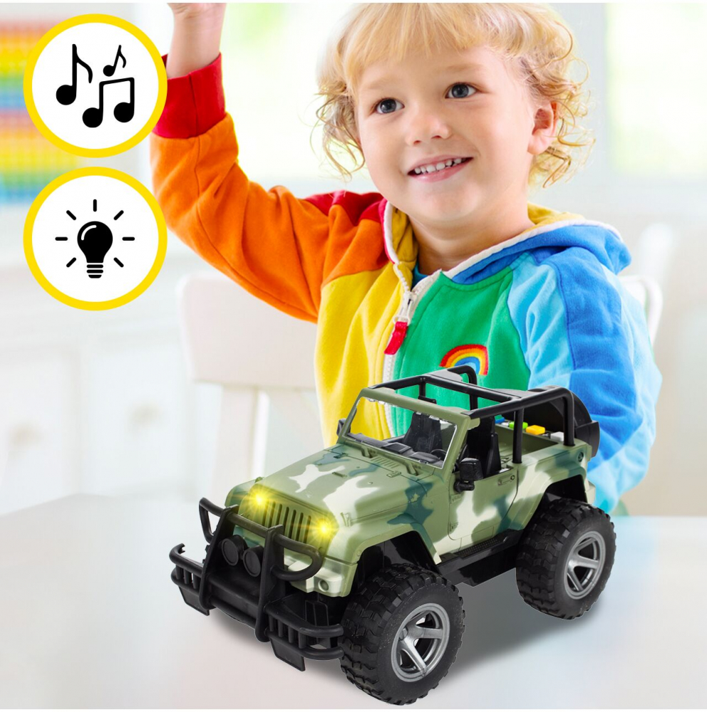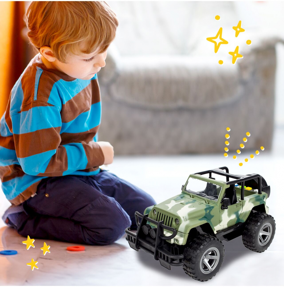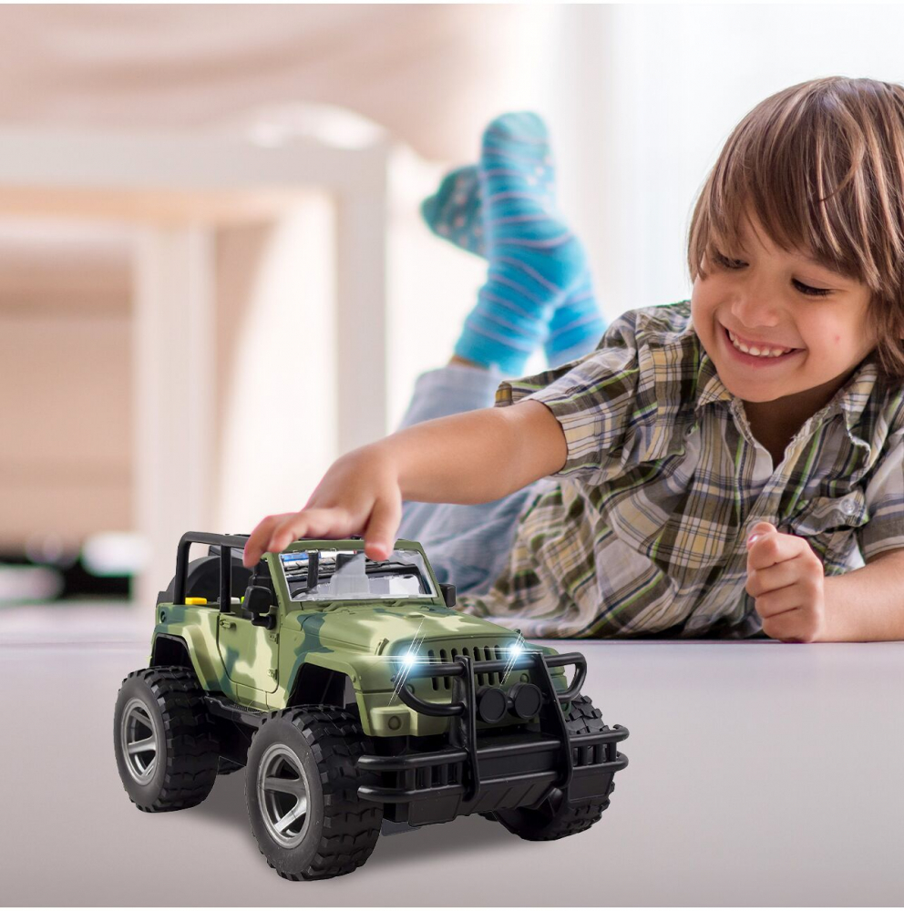 * Aceasta masina off-road Jeep militar este o jucarie ideala pentru copiii pasionati de vehicule militare si aventuri in aer liber.