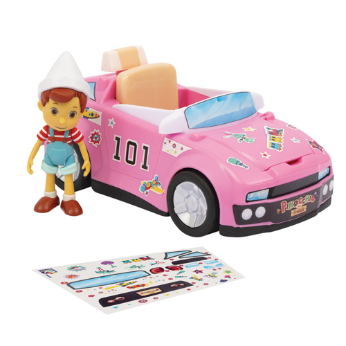 1x masina Pinocchio si prietenii, 1x figurina de colectie, 1x foaie de autocolante