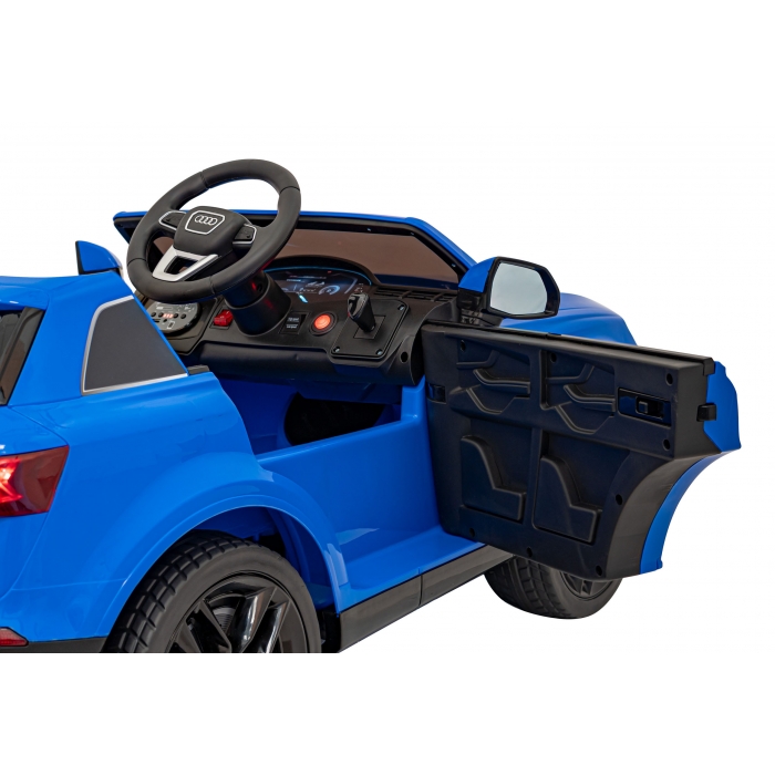 Masinuta electrica pentru copii Audi Q7 New Lift albastru 70W cu telecomanda, pornire lenta, panou audio, scaun piele si roti din spuma Eva