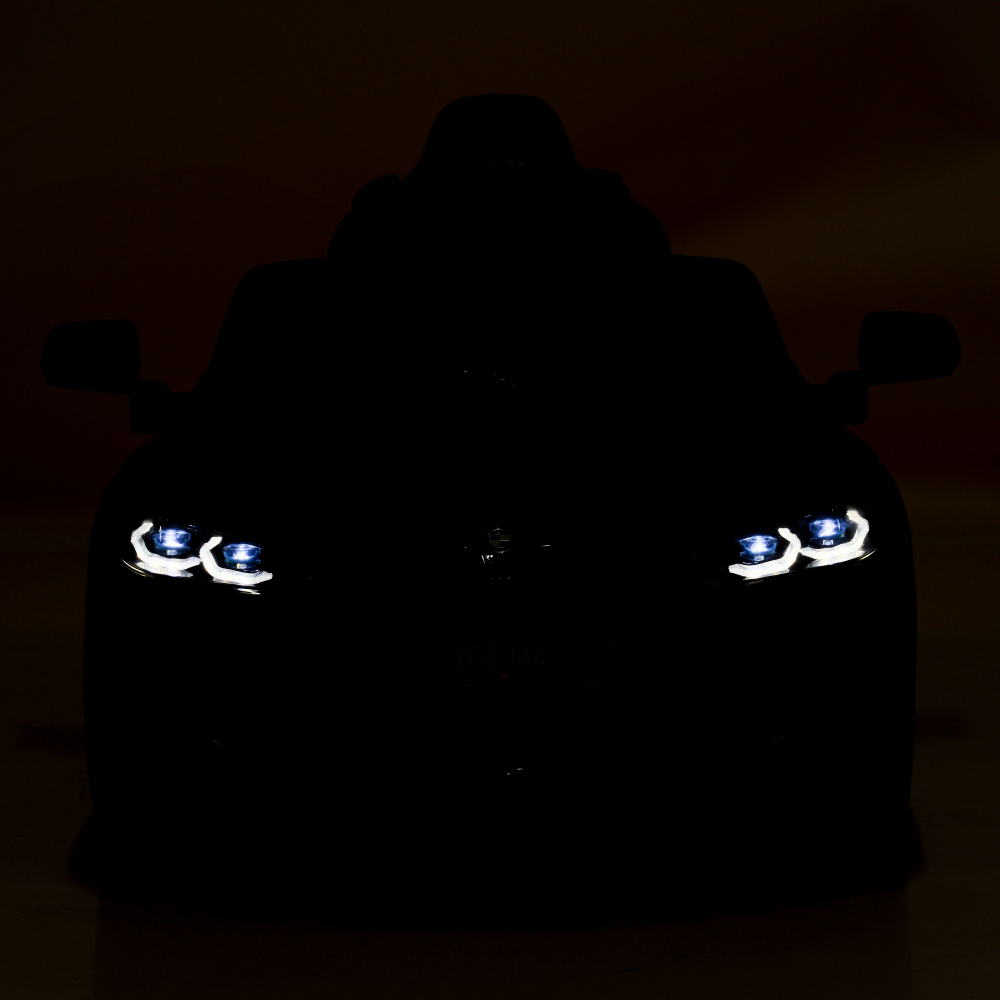 Masinuta electrica pentru copii BMW M4 Painted Black 12V 90W cu echipare premium ,deschidere usi si licenta, panou audio, roti din spuma Eva, pornire la buton, lumini si telecomanda