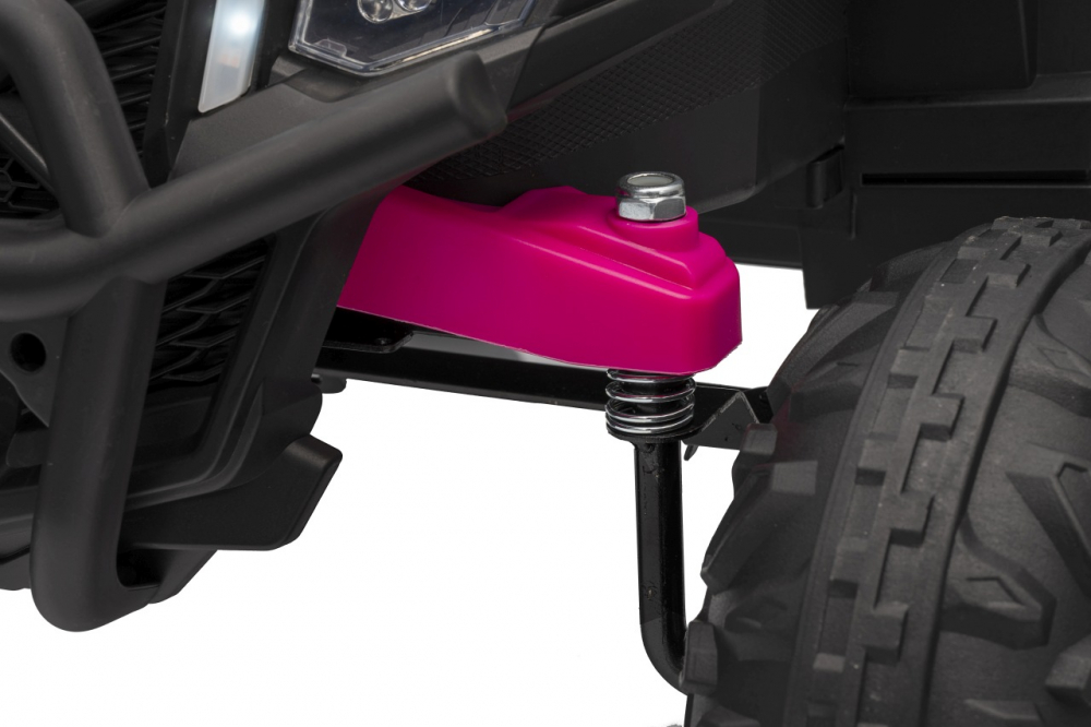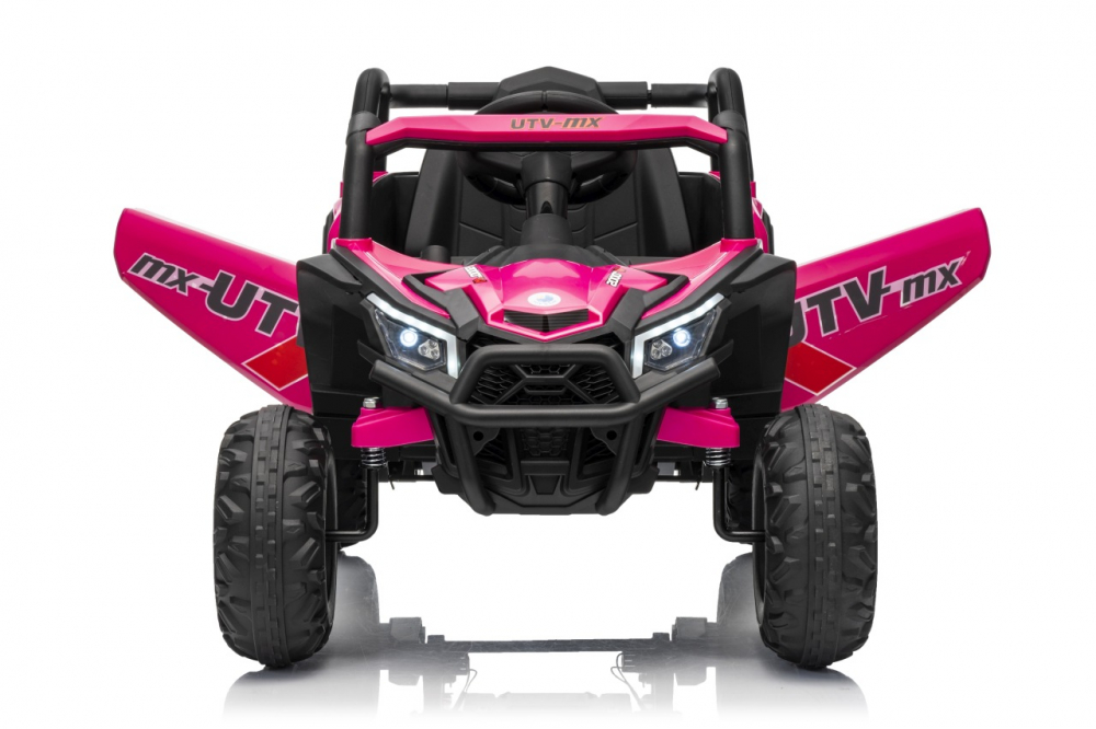 Masinuta electrica pentru copii Buggy Madman UTV-MX Pink, 4 motoare 35W, baterie 12V10Ah, telecomanda 2.4 GHz, roti spuma EVA 24x10 cm, sarcina maxima 30 kg, scaun piele ecologica, deschidere usi, MP3, USB, Bluetooth
