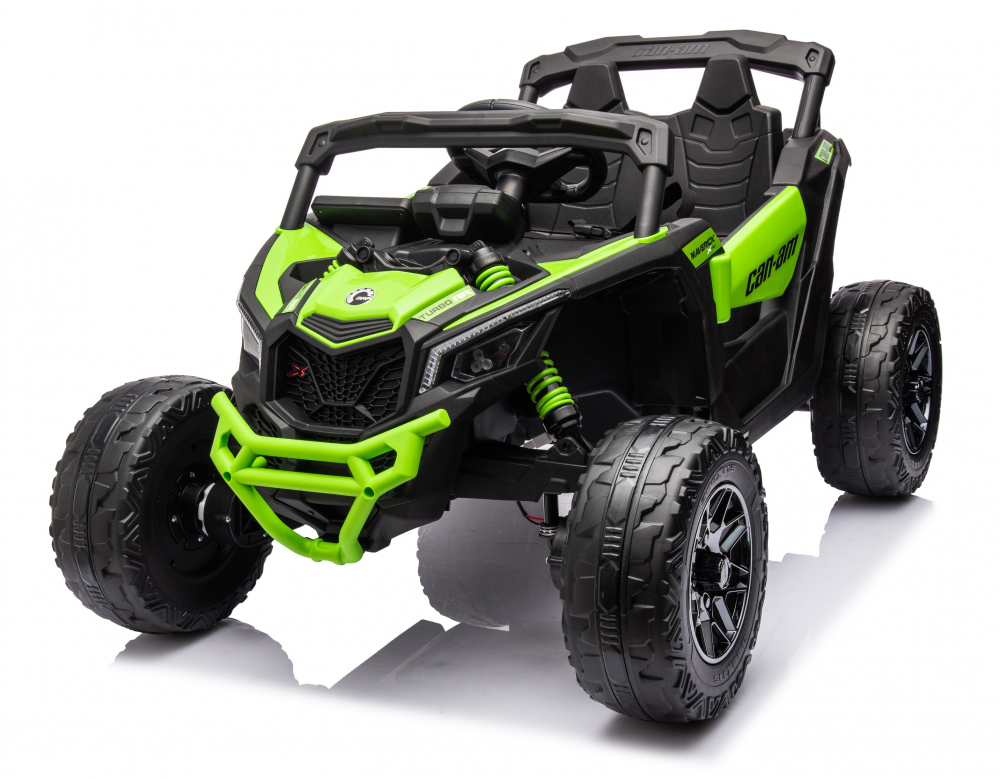 Masinuta electrica pentru copii Can Am Marverick UTV Green 12V 90W cu telecomanda 2.4G, deschidere usi, scaun ergonomic, pornire la buton, functii muzicale si suspensii