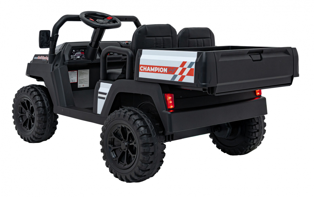Masinuta electrica pentru copii Champion Black, motor 2 x 200W, baterie 24V/9Ah, cu telecomanda 2.4 GHz, 3 viteze, slow start, amortizoare, lumini led, panou audio integrat, portbagaj