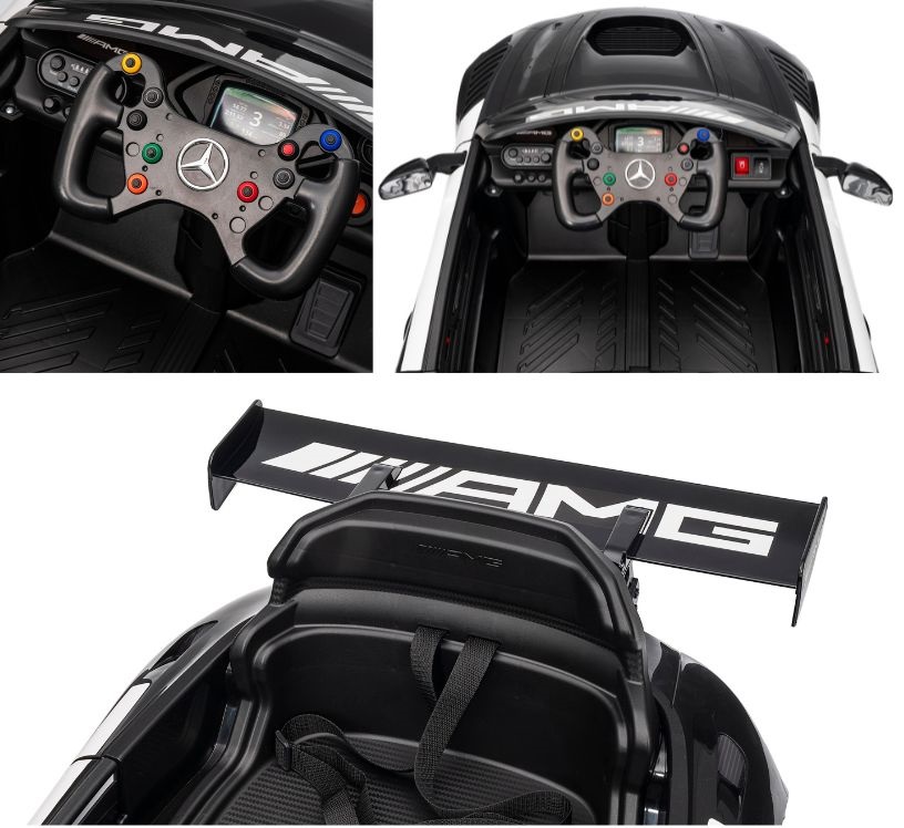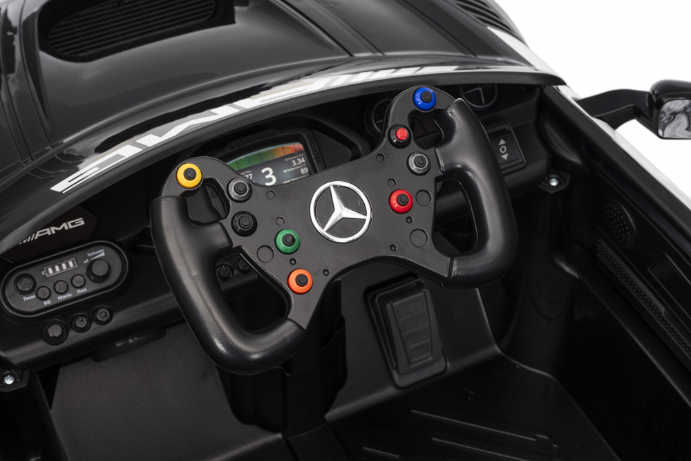 Aceasta masinuta electrica Mercedes-Benz AMG cu licenta oficiala ofera o experienta premium de condus pentru copii de la 3 ani, avand doua motoare de 39W, roti EVA, scaun din piele si telecomanda 2.4G. Dotata cu Bluetooth, lumini LED, muzica, display baterie, usi cu deschidere si centura de siguranta, suporta o greutate maxima de 30 kg, fiind perfecta pentru aventuri pline de stil si siguranta.