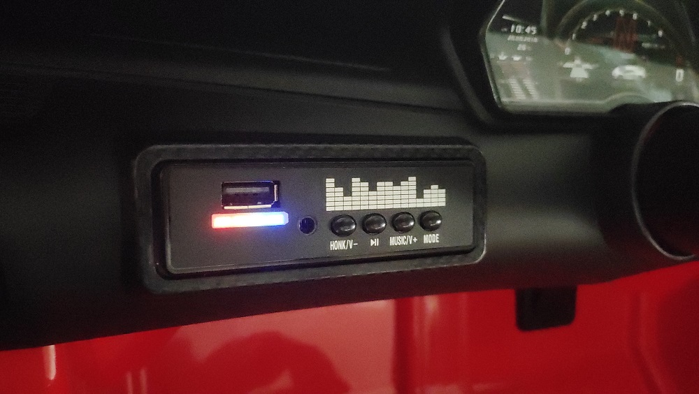 - Masinuta este dotata cu sistem audio cu muzica integrata, port USB/MP3 pentru a asculta melodiile preferate si chiar povesti in limba engleza, perfecte pentru a-i stimula imaginatia si a-l familiariza cu o limba straina.