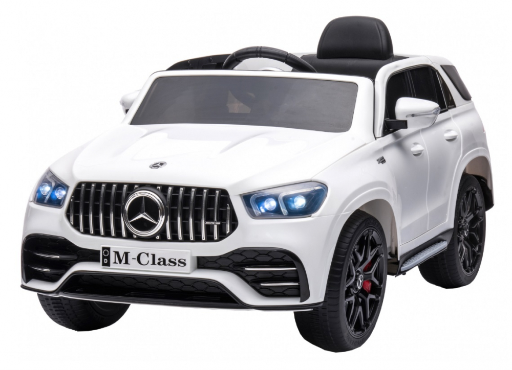 Masinuta electrica pentru copii Mercedes M Class White cu scaun de piele, doua motoare, telecomanda, lumini, volan multifunctional si suspensii