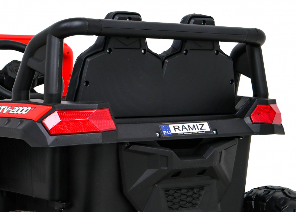 Masinuta electrica pentru copii UTV 2000M Racing Red, cu 4 motoare de 45W, baterie 12V10A, telecomanda de 2.4 GHz, cu 3 viteze, roti EVA, lumini LED frontale, panou audio integrat MP3, USB, cu deschidere usi