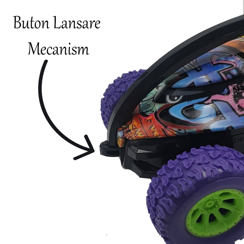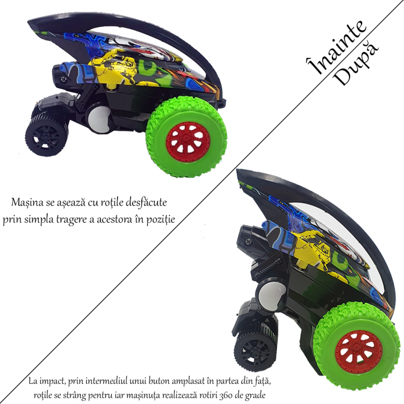 - Masina functioneaza cu actiune pull back iar la impact aceasta se roteste 360 de grade.