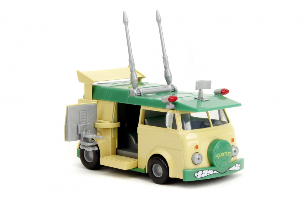 Construita din metal turnat (die-cast) de inalta calitate, masinuta reda fidelul celebrului Party Wagon, vehiculul legendar al testoaselor Leonardo, Michelangelo, Donatello si Raphael.