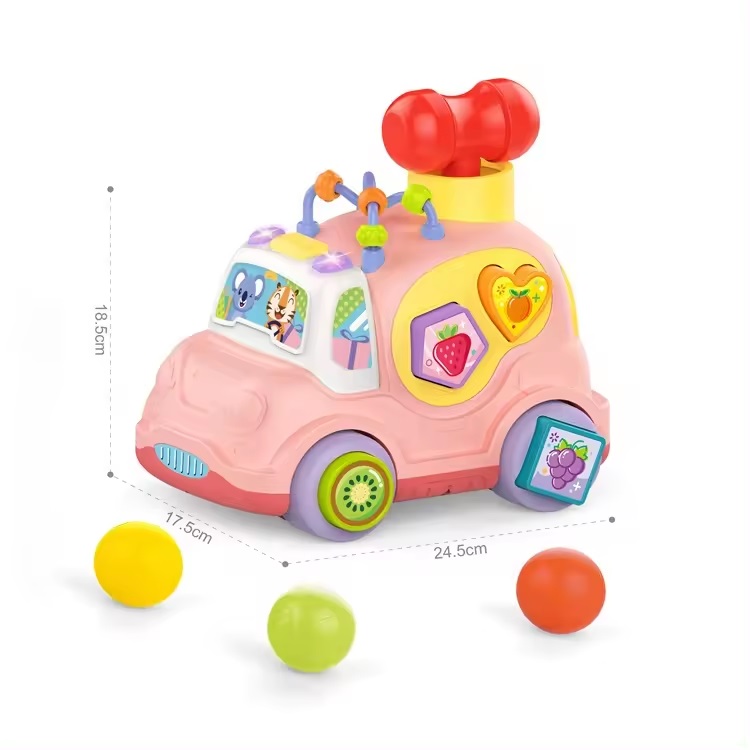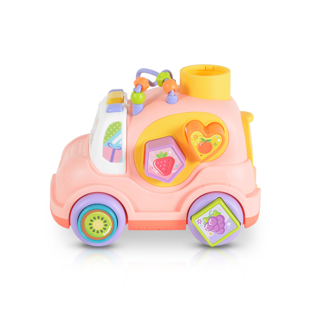 Masinuta muzicala cu forme de sortat si activitati Happy Car Light Pink