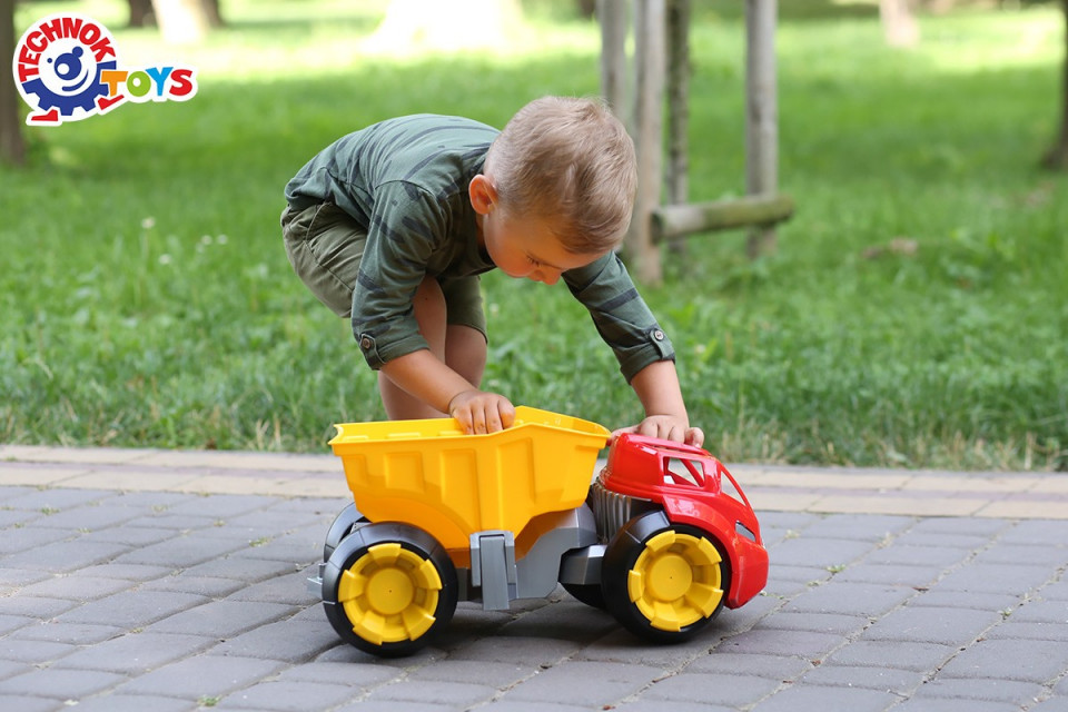 Merita remarcata versatilitatea jucariei: datorita descarcarii laterale, camionul basculant poate fi utilizat pe amplasamente limitate, iar rotile puternice realizate prin metoda suflata, ii confera o practicabilitate ridicata.