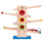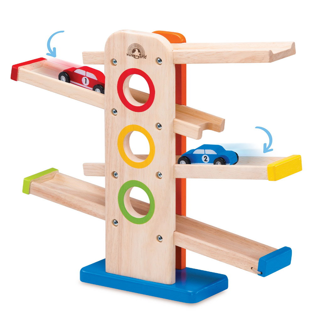 • Rampa include 4 segmente de pista inclinate, fiecare avand la capat o alta culoare si 2 masinute colorate din lemn.