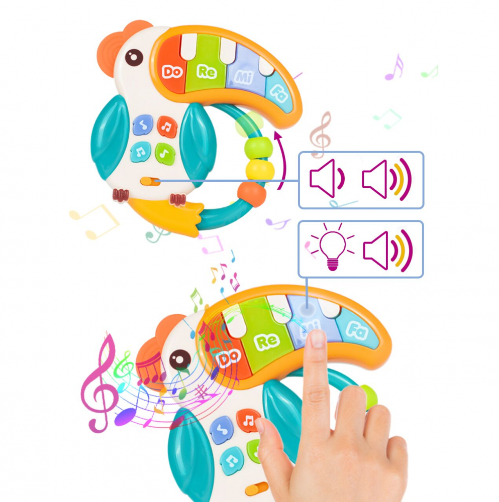 Pianul in forma de pasare exotica are un control al volumului in doua trepte si multe melodii.