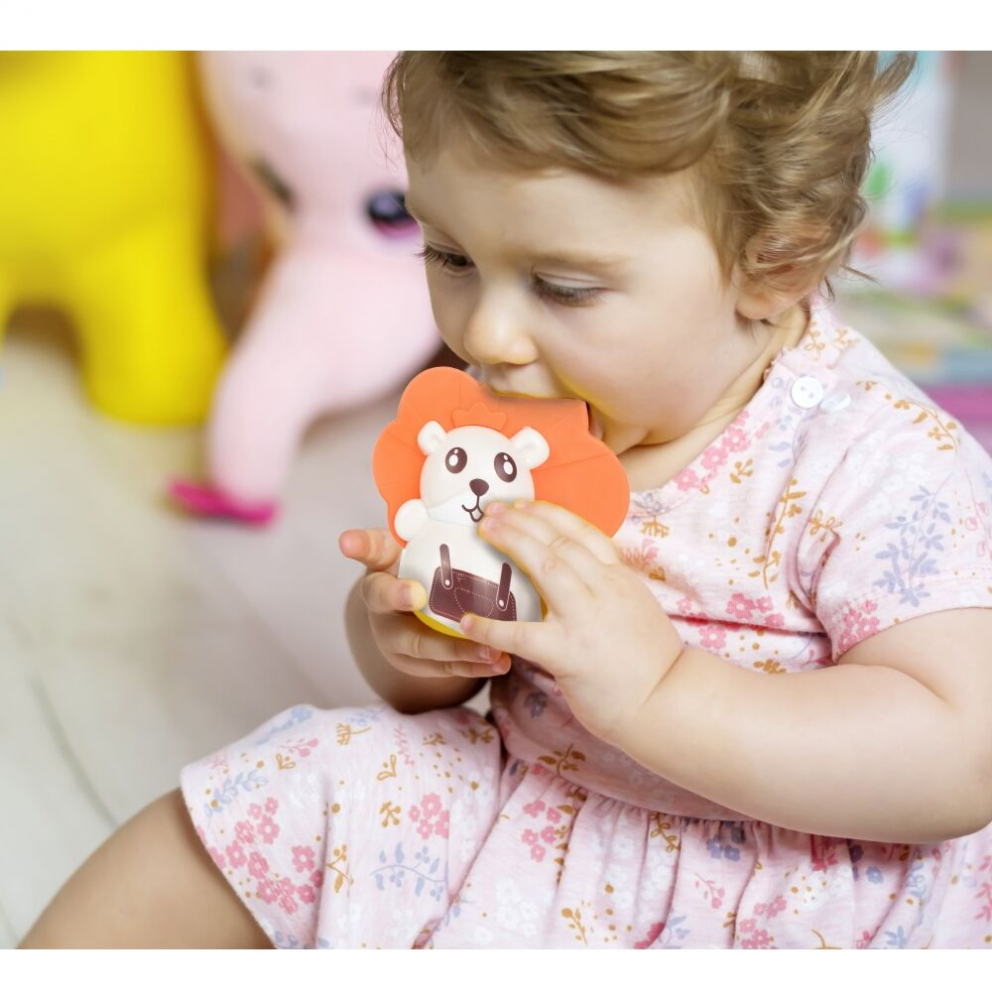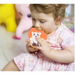 -Doua figurine: un leu si un elefant, ce au elemente din cauciuc moi si pot fi folosite ca dispozitiv de dentitie pentru copil.