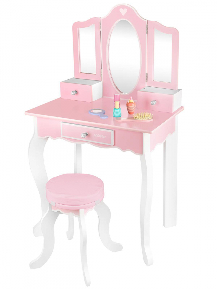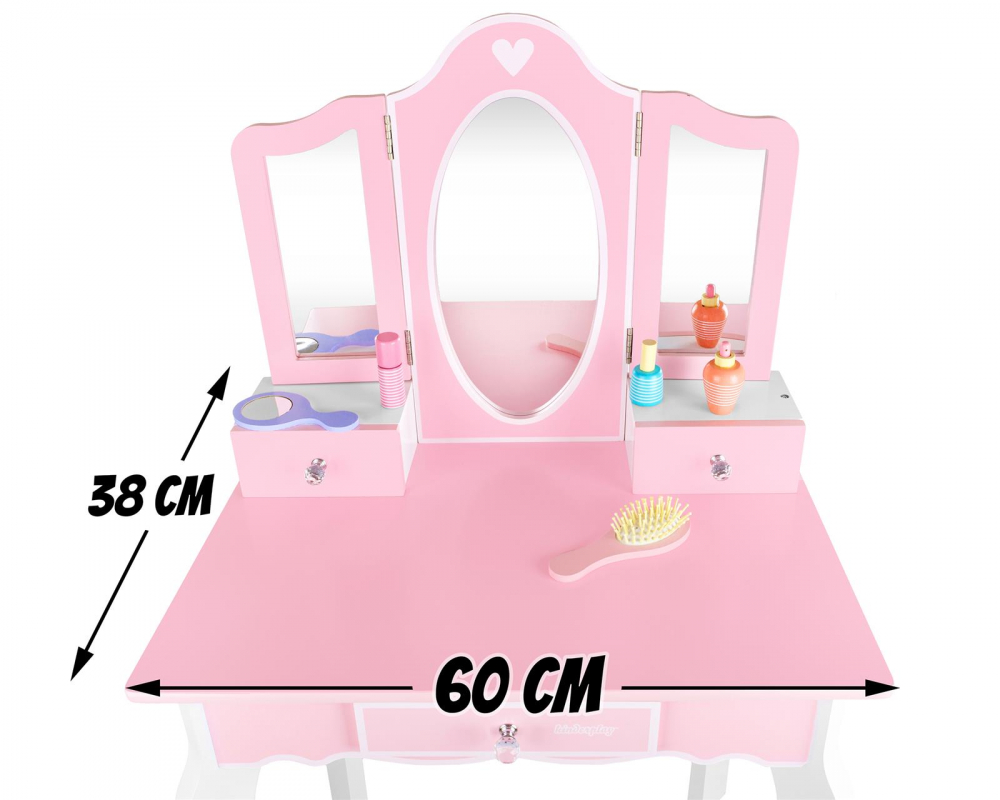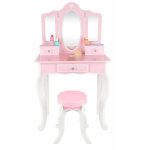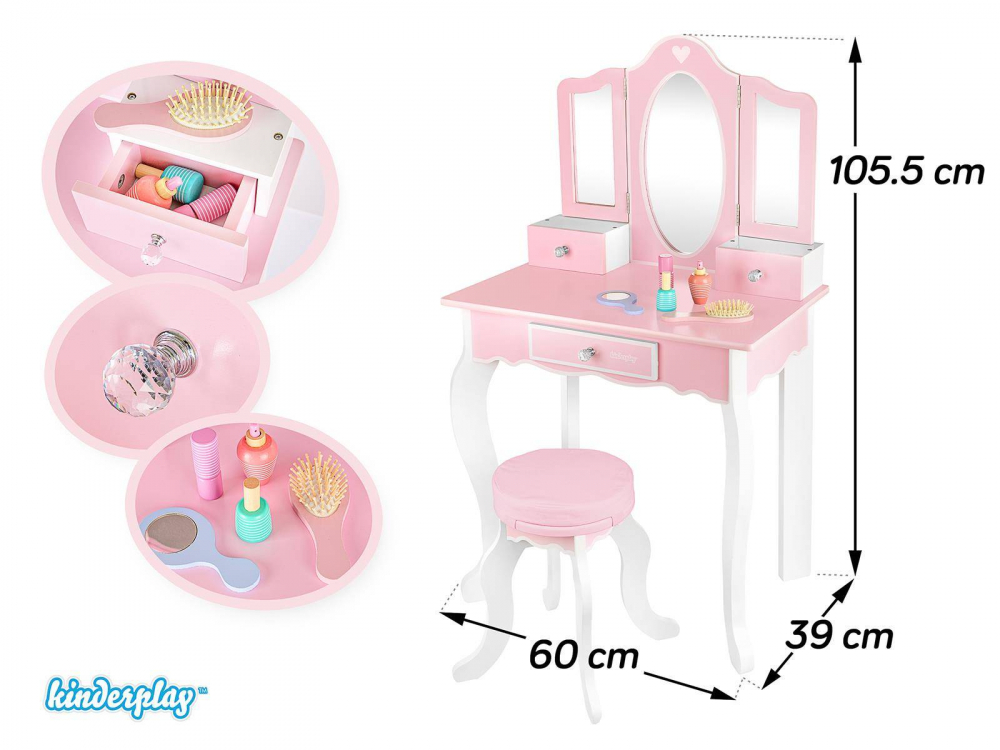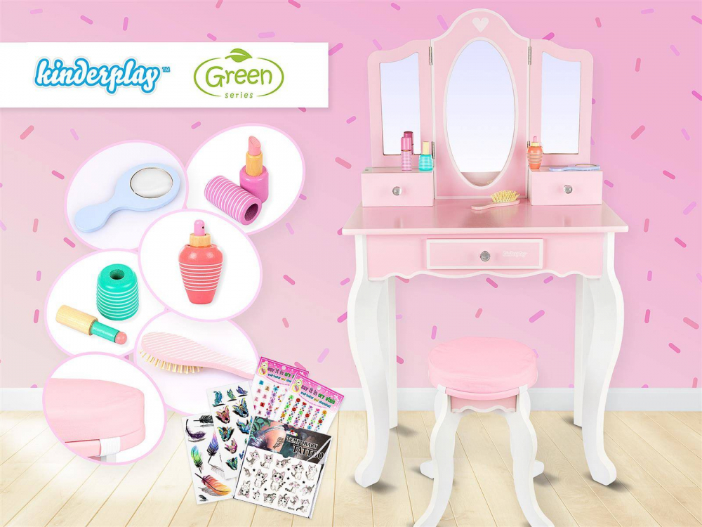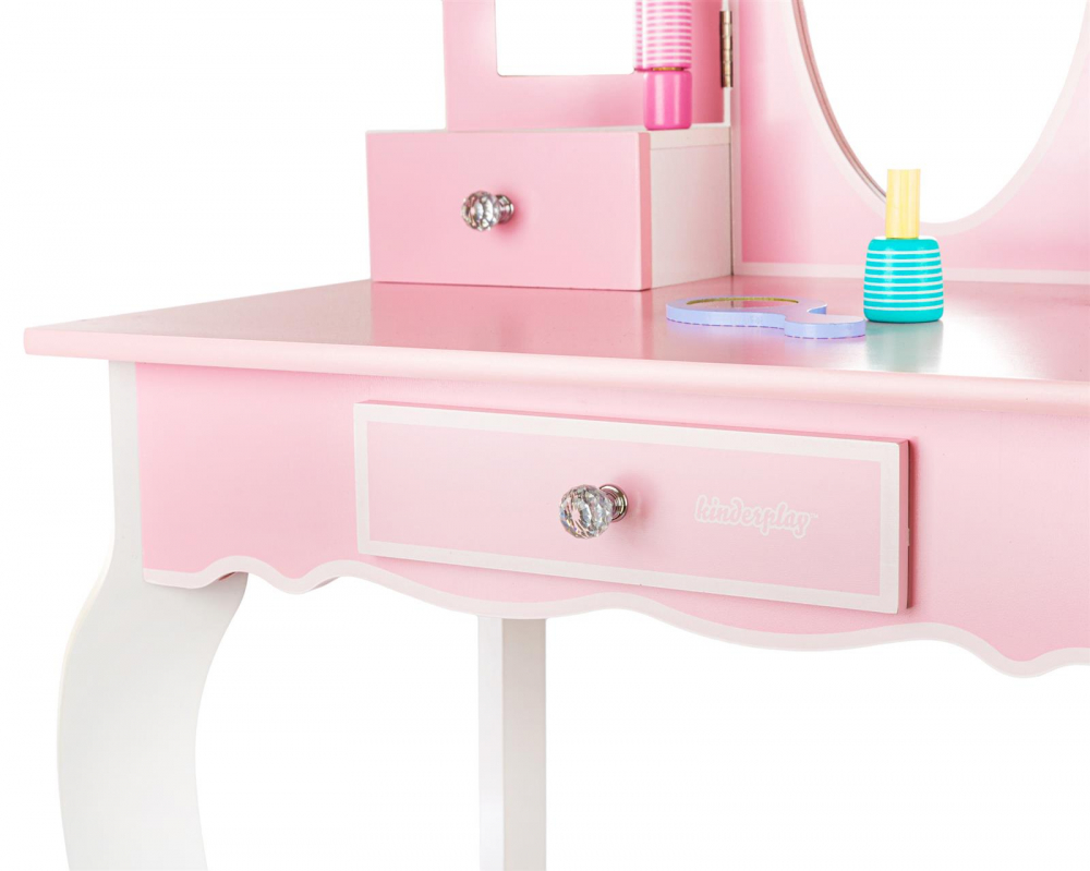 Masuta de toaleta cu structura din lemn pentru copii, Kinderplay, cu oglinzi sigure din plexiglas, scaunel cu perna si accesorii esentiale incluse, 60 x 38 x 105.5 cm Pink