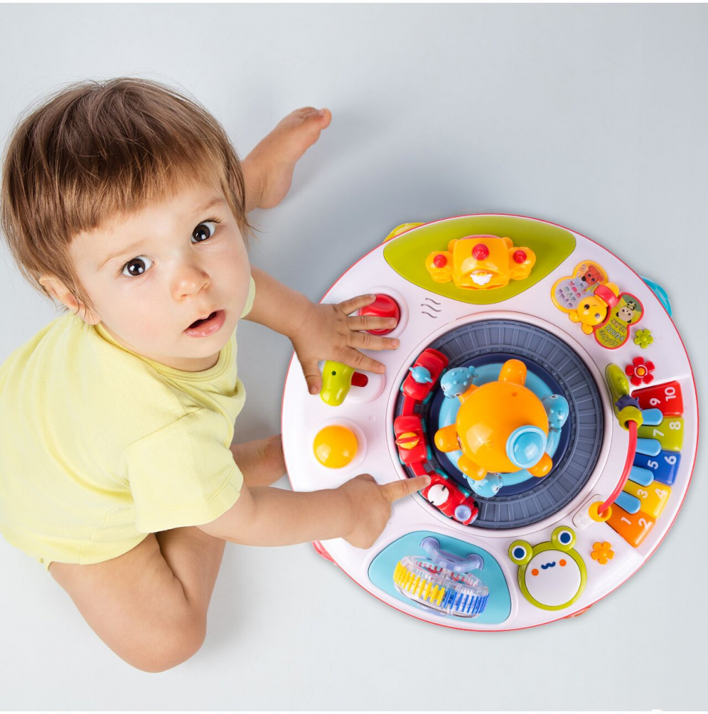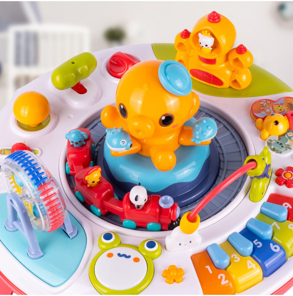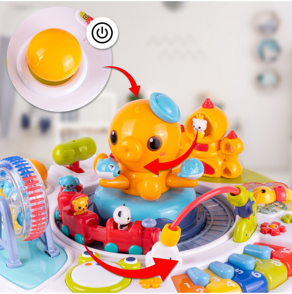 Manipularea pieselor mobile: copilul dumneavoastră poate mișca, roti sau manipula părțile mobile ale mesei, cum ar fi roțile, figurile de alunecare și alte părți interactive. Acest lucru ajută la dezvoltarea abilităților cognitive, motorii și de explorare spațială.
