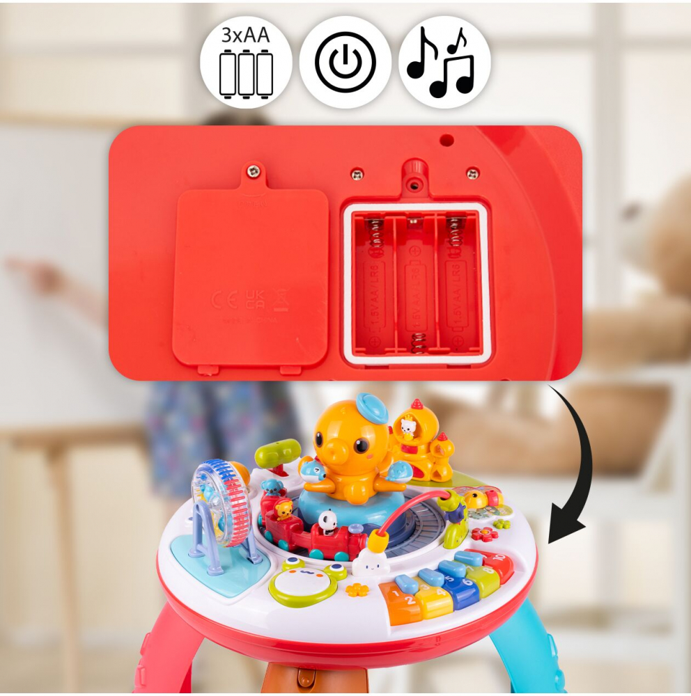 Micuțul tău poate explora masa apăsând butoane colorate, care activează o varietate de sunete și efecte. Acest lucru ajută la dezvoltarea abilităților manuale și a coordonării motorii.