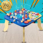 - Stimulare senzoriala: texturile variate ale lemnului si ale elementelor interactive ii vor ajuta pe cei mici sa-si exploreze lumea prin atingere, iar sunetele muzicale vor stimula auzul.