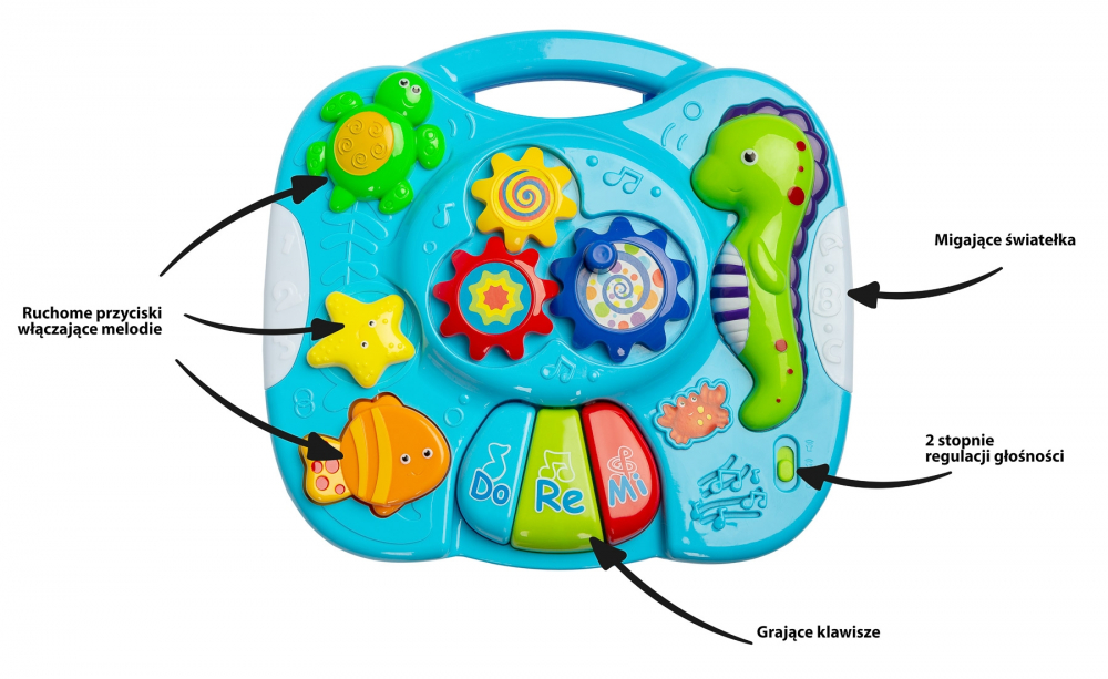 Masuta interactiva, care va oferi multa distractie pentru cei mici. Blatul de masa este echipat cu un mini pian cu taste DO RE MI, 3 butoane (fiecare functioneaza diferit) care pornesc melodii diferite si un buton cu angrenaje.