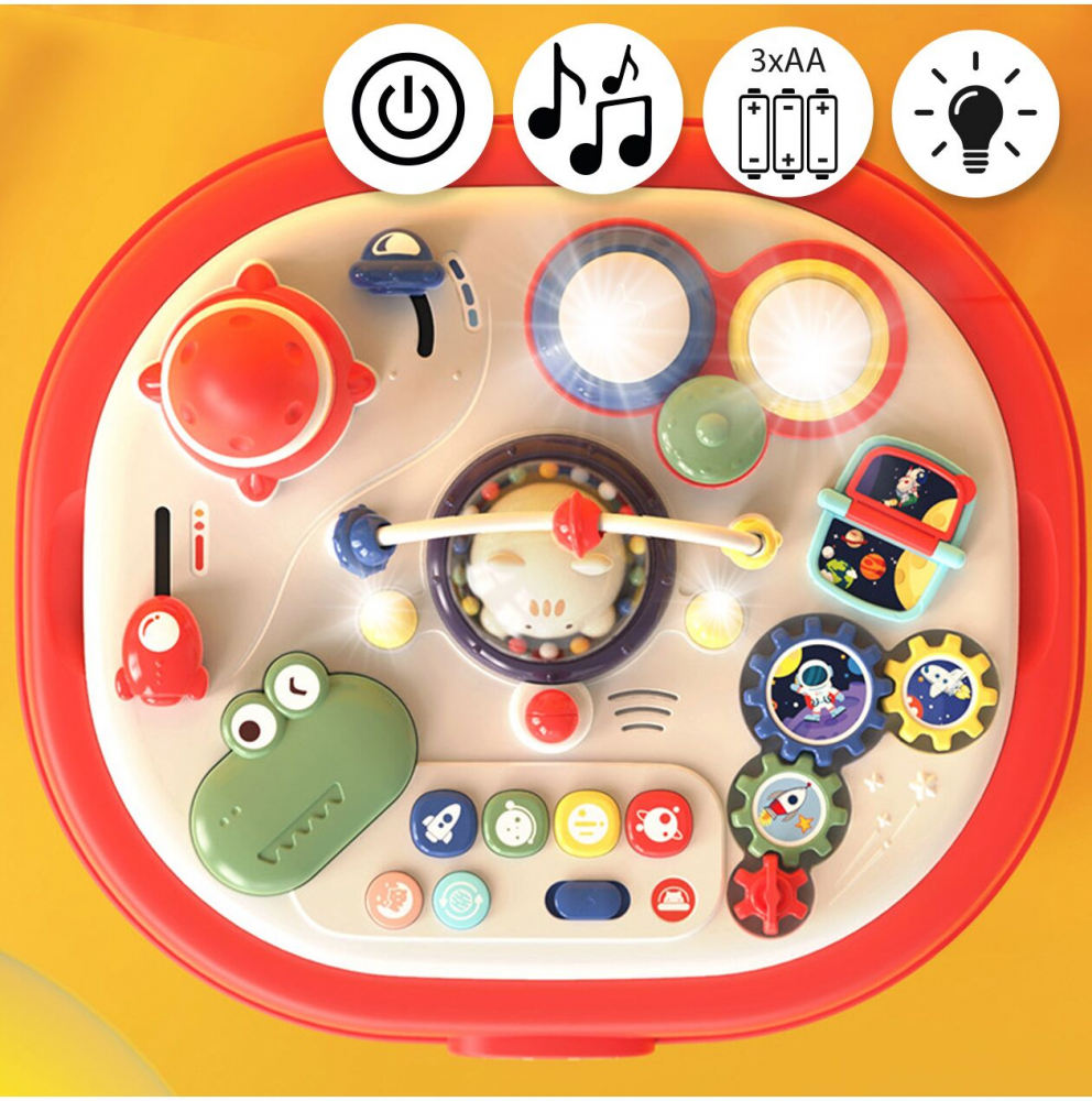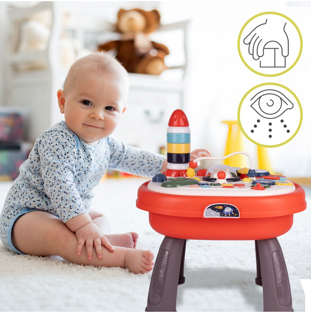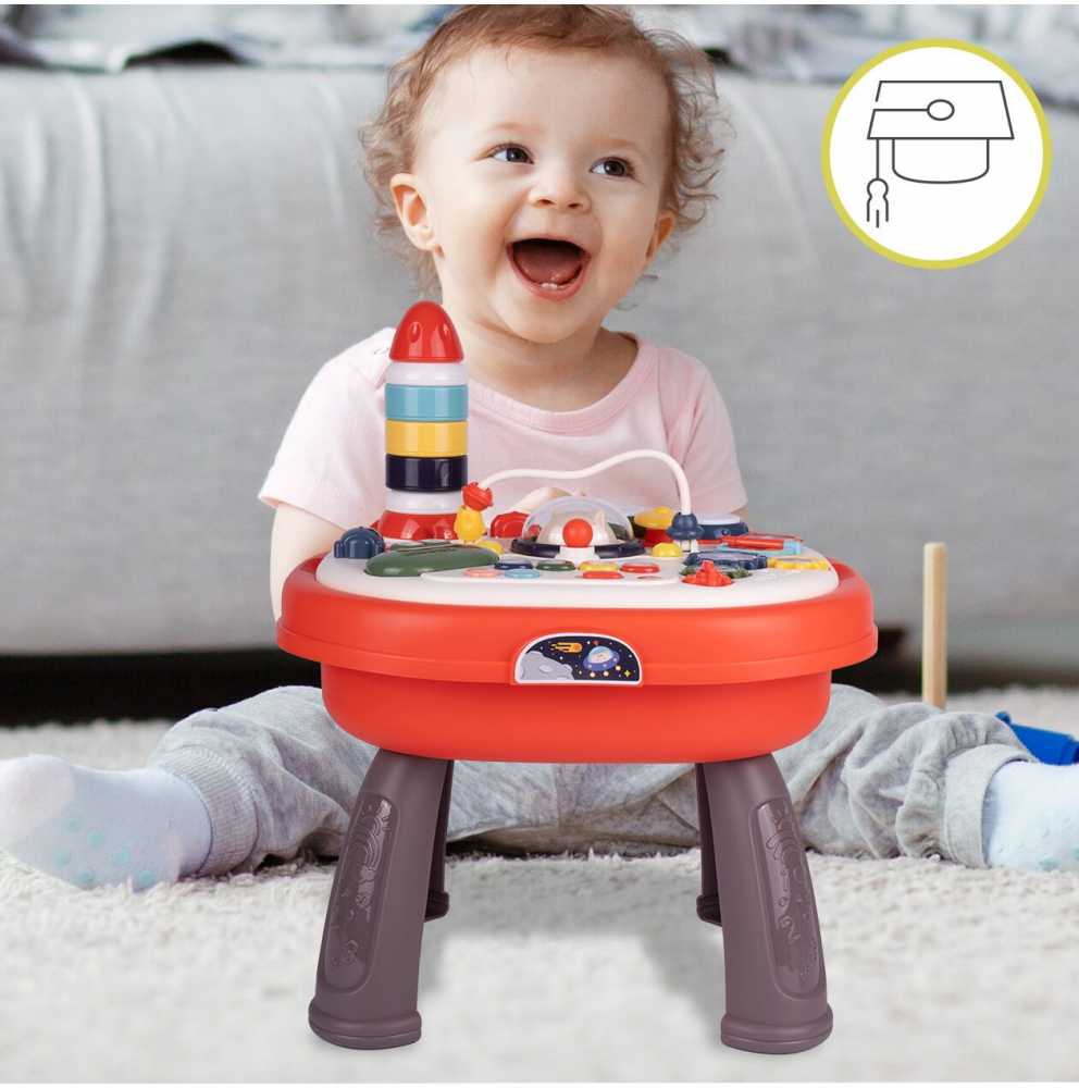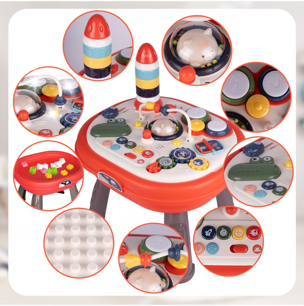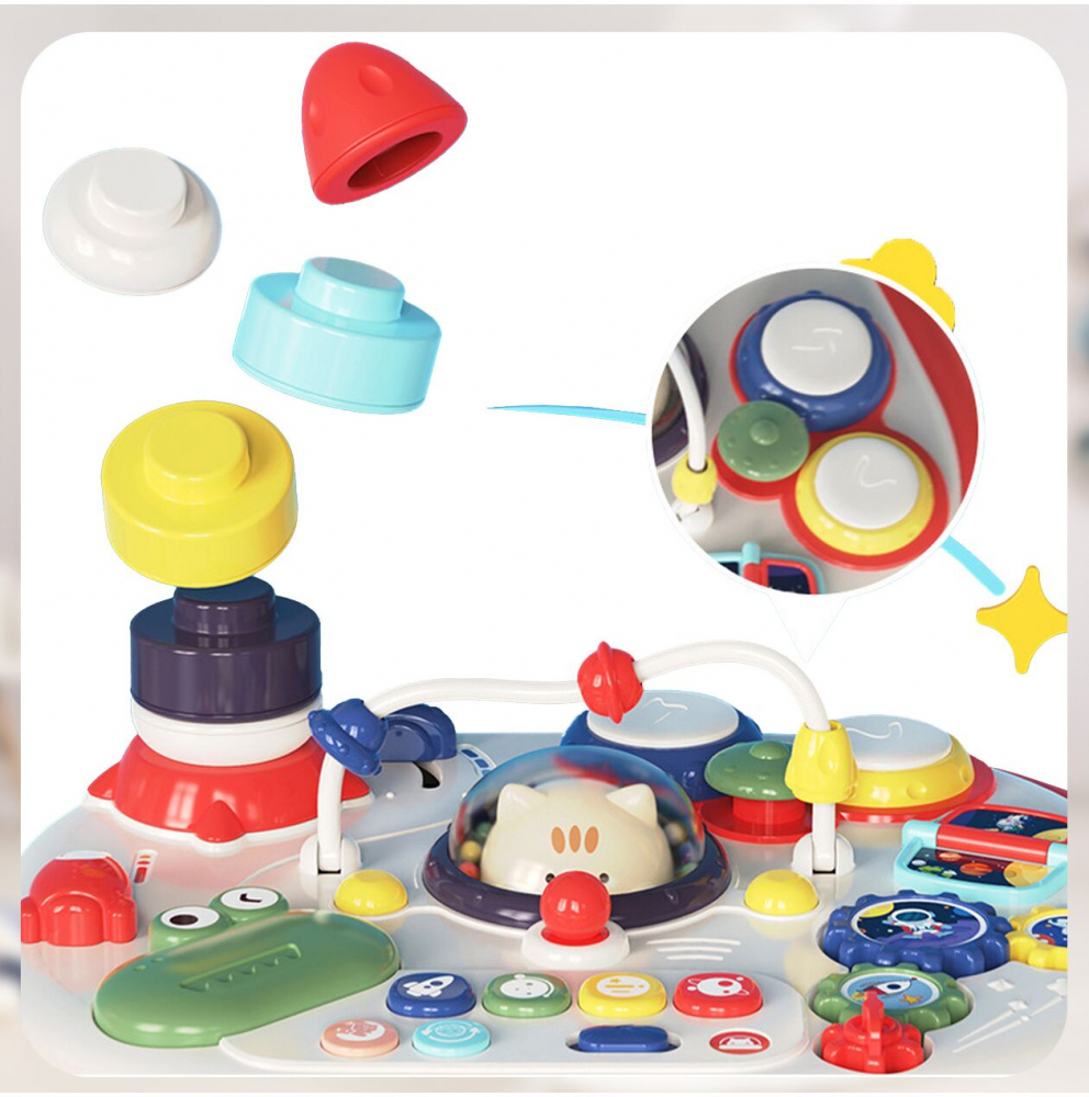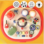 Masa ofera multe functii interactive, cum ar fi o pista de margele, butoane care produc sunete si elemente mobile