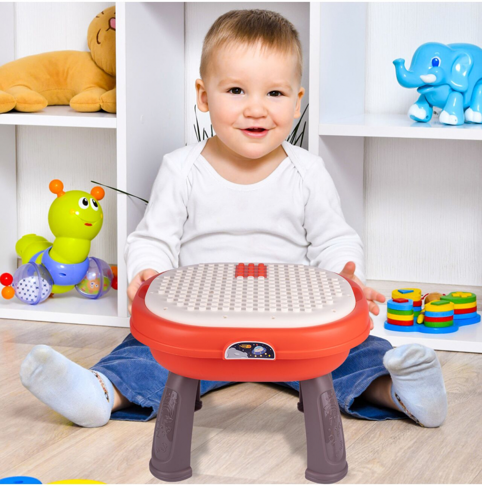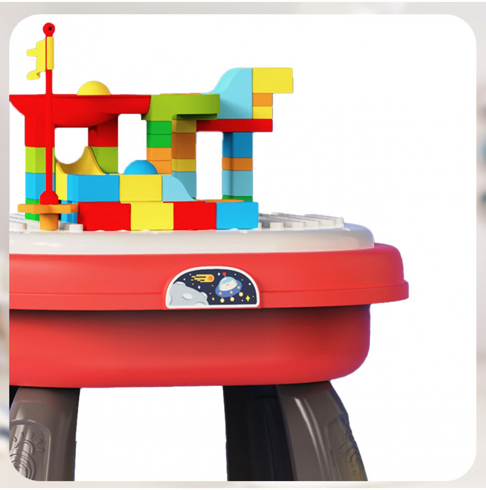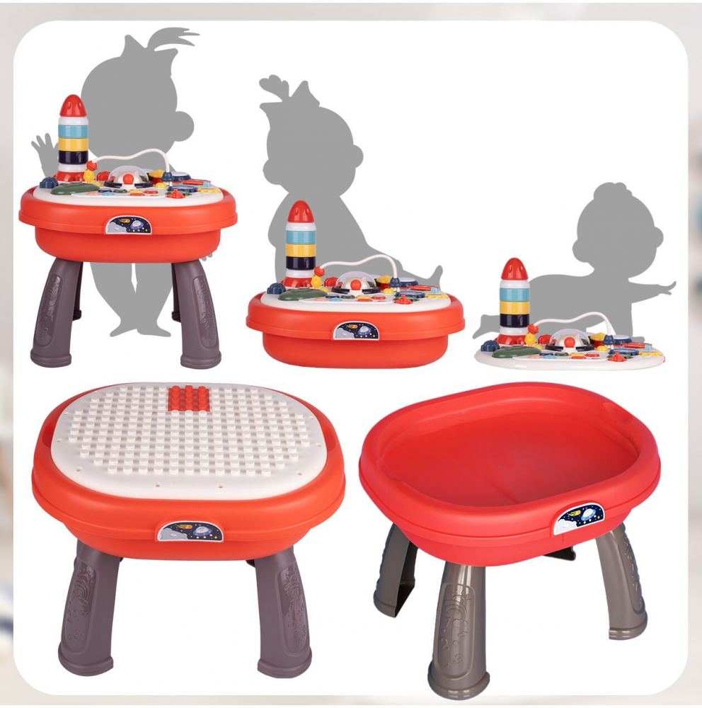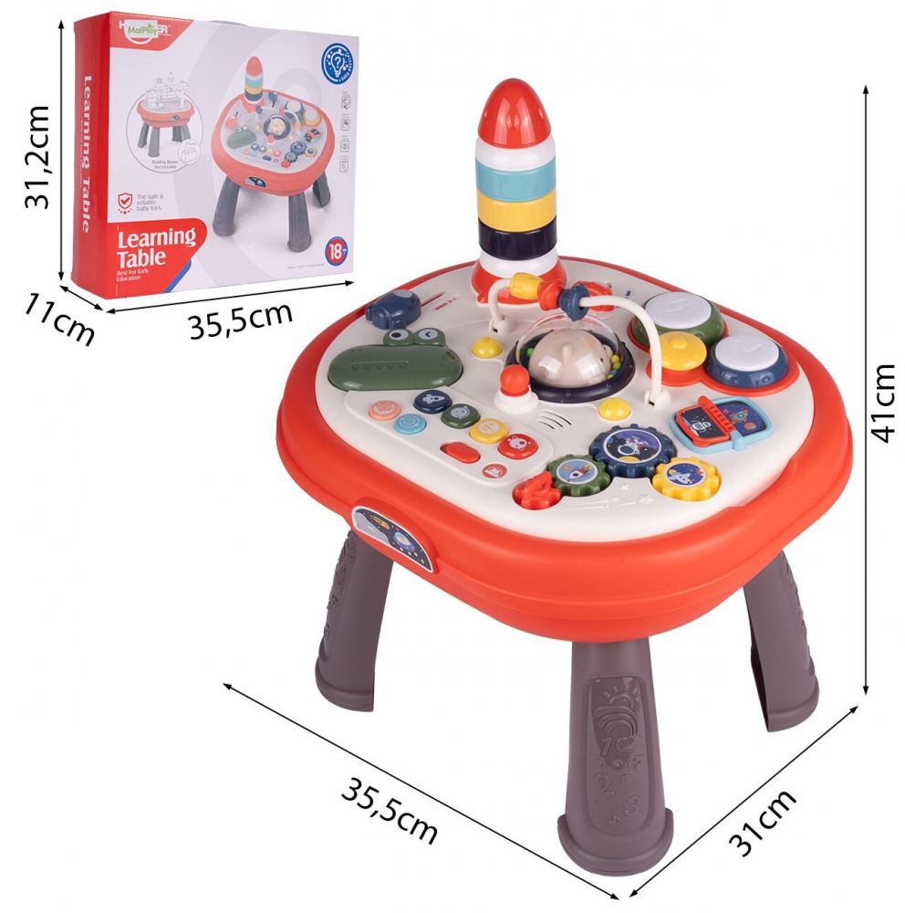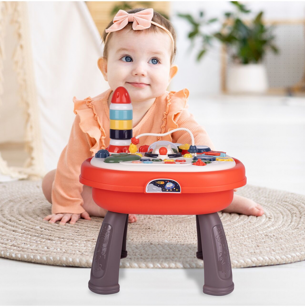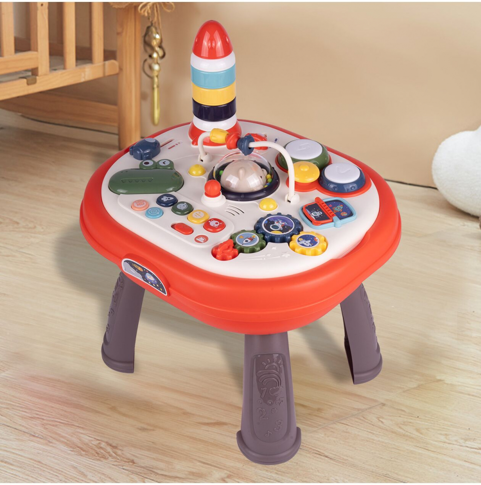 Masa ofera multe functii interactive, cum ar fi o pista de margele, butoane care produc sunete si elemente mobile