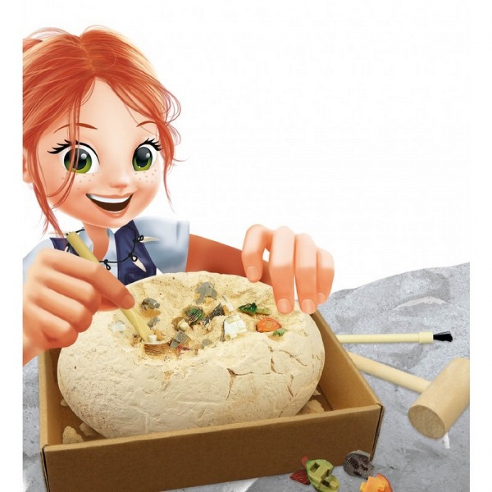 Contine:1 ou gigant, 1 ciocanel, 1 dalta, 1 pensula, 1 burete, 1 tava, 4 carduri-dinozaur