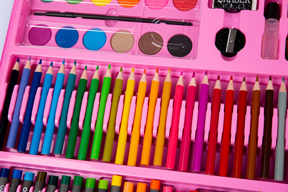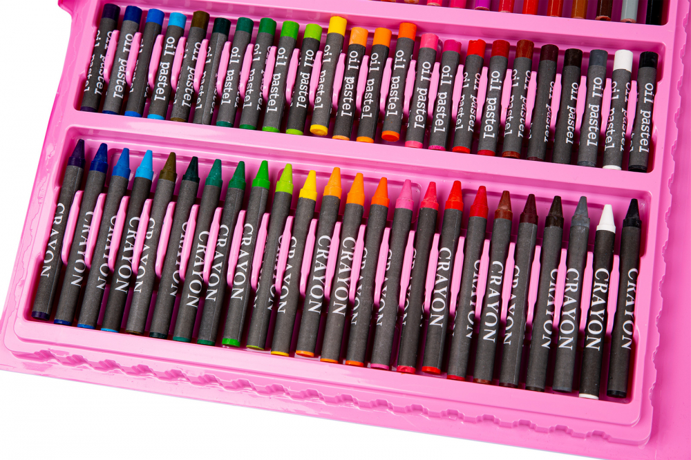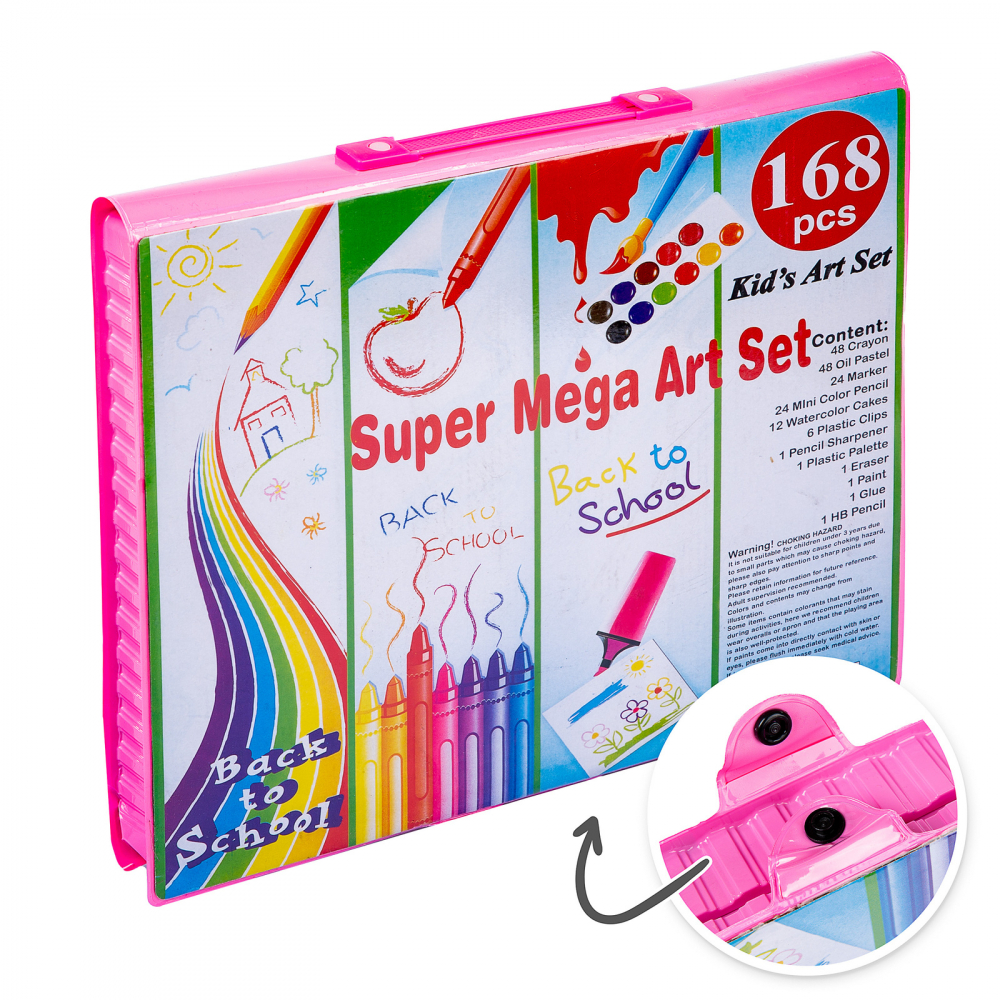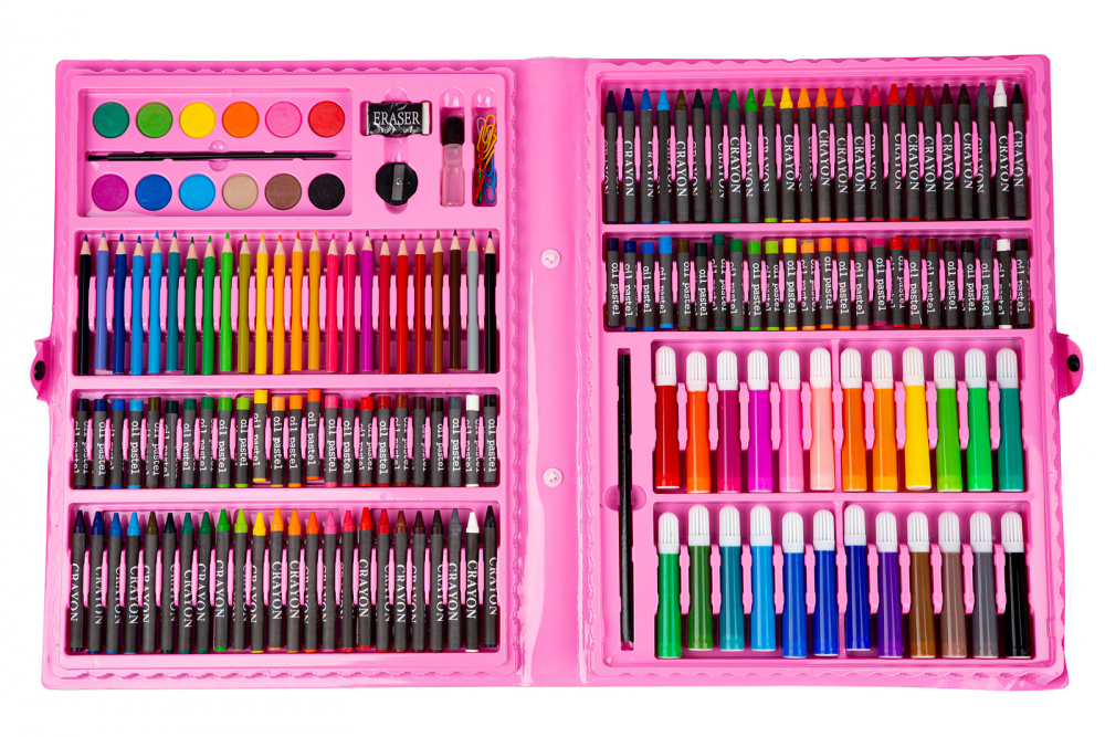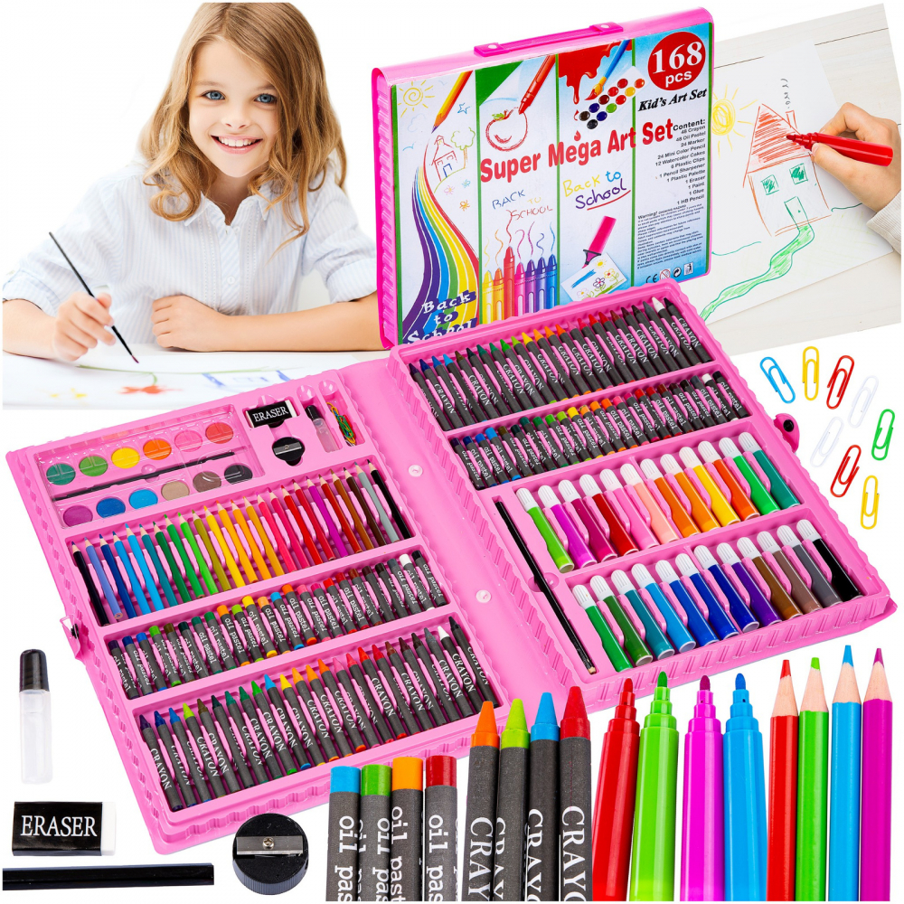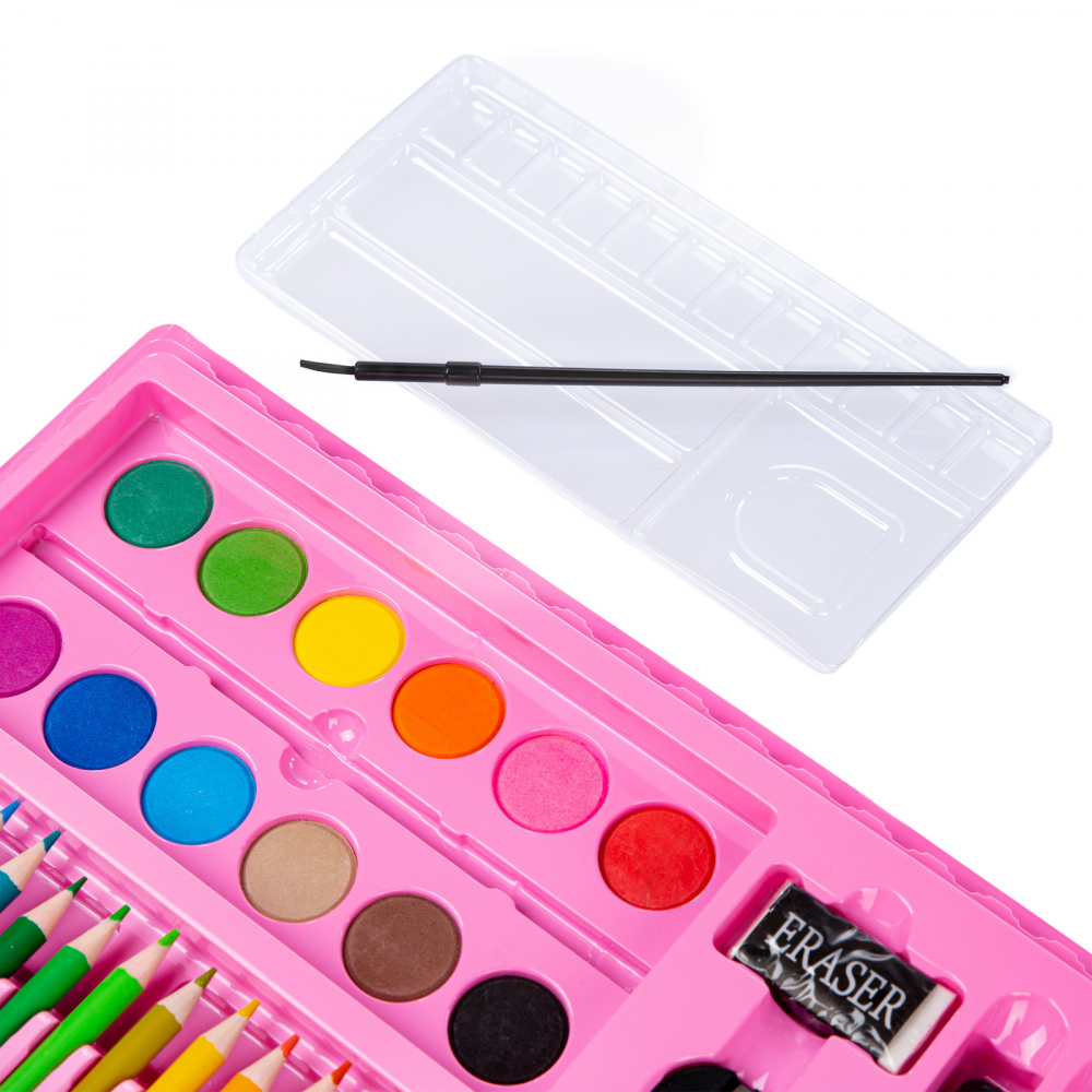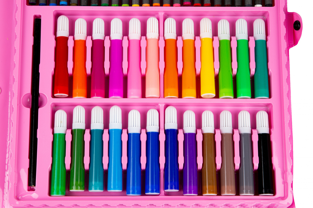 Mega set complet 168 elemente , pentru pictura si desen, cu acuarele, carioci, creioane cerate in valiza compartimentata Pink
