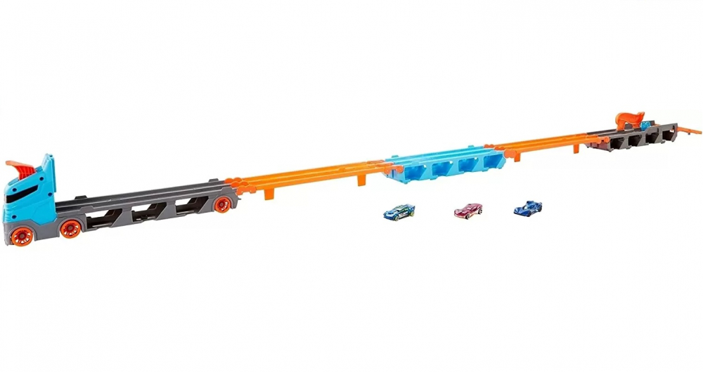 Micile geamuri tip vitrina ale remorcii expun cele peste 20 de masini Hot Wheels pe care le poate transporta, iar cand copiii trag inchizatoarea din spate, camionul se desface intr-o pista de curse de 1,8 metri lungime!