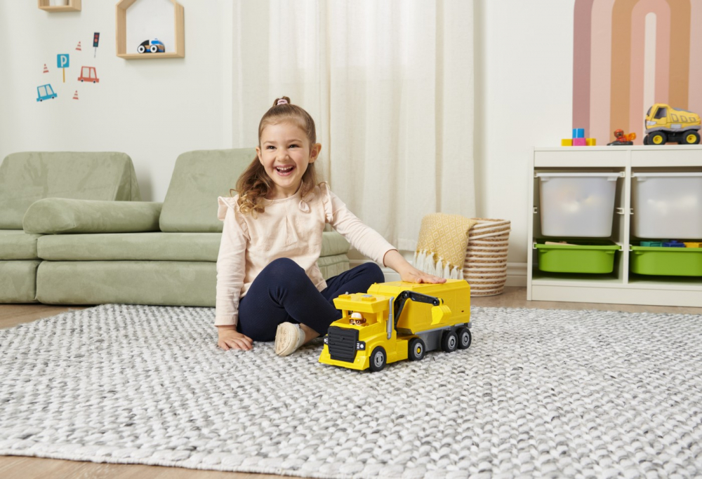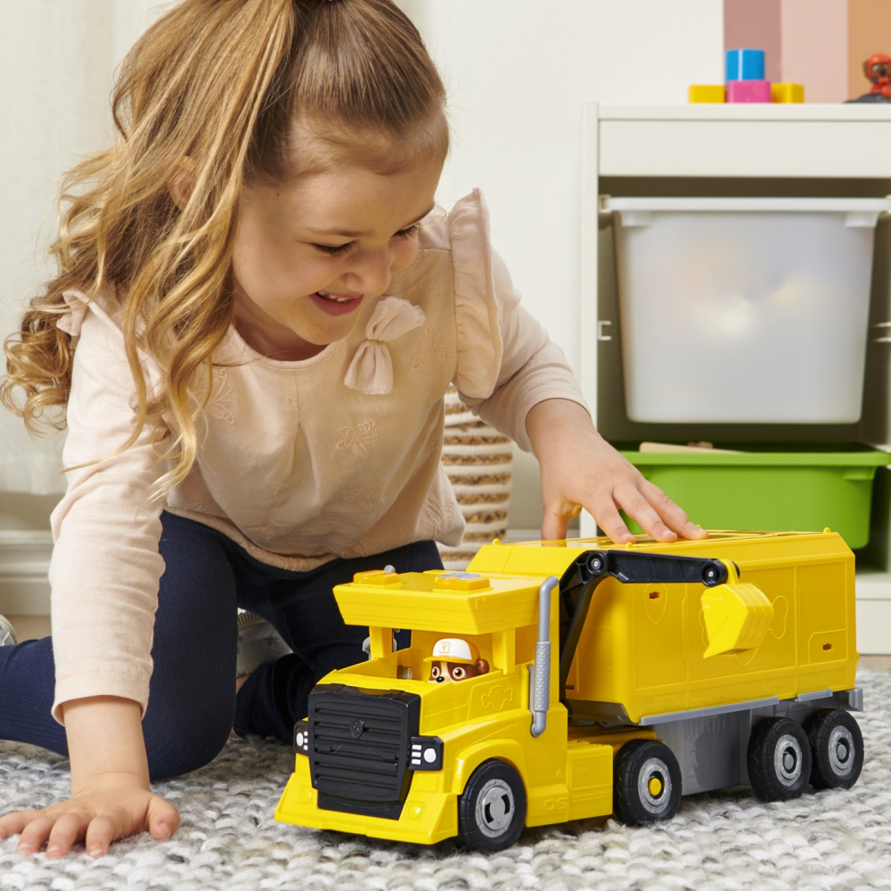 Are remorca care se detaseaza de cabina, folositi lopata articulata din spatele cabinei pentru a sapa, remorca se deschide intr-un al doilea vehicul, trageti Rubble inauntru si urmariti cum se extinde macaraua.